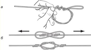 Рис. 2. Крепление поводка к основной леске: а – изготовление петли с помощью узла восьмерки; б – соединение «петля в петлю» Озерный лещ более осторожен, чем обитающий в реках и водохранилищах. Поэтому в оснастке не должно быть таких элементов, как вертлюжки, карабинчики и застежки. К основной леске поводок желательно присоединять способом «петля в петлю» (рис. 2) . Такое крепление практически не отражается на прочности оснастки и в то же время позволяет быстро заменять поводки. При ловле с грузилом (рис. 3) основная трудность заключается в том, чтобы при каждом забросе приманка оказывалась строго в точке прикармливания. С этой целью я придерживаюсь 2—3 ориентиров (обычно на противоположном берегу), расстояние до точки отмечаю на леске водостойким маркером. Закармливание делаю довольно крупными шарами прикормки, закатанной в глину с добавлением аквариумного гравия. Можно прикармливать и с помощью большой кормушки, а ловить с грузилом, менее распугивающим рыбу во время заброса, особенно на небольших глубинах.