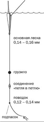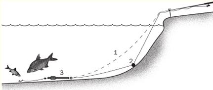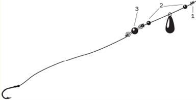 Рис. 1. Оснастка бортовой поплавочной удочки при ловле озерного леща Если вы ловите бортовой поплавочной удочкой, то при отсутствии поклевок время от времени необходимо приподнимать насадку над дном с последующим перемещением ее влево или вправо на 0,5—1,0 м. Для такого манипулирования снастью вполне подойдет удочка длиной до 1,5 м. Вполне годится и короткое легкое спиннинговое удилище.