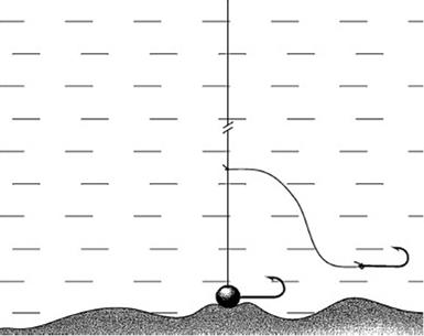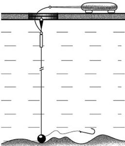 Рис. 1. Вариант лещовой оснастки с мормышкой и коротким поводком Поплавочная лещовая снасть не отличается особой сложностью и многократно описана в рыболовной литературе. Хотелось бы только заметить, что снасть должна быть настроена четко (рис. 2). Некоторые рыболовы рекомендуют в оснастку включать два грузила: основное и дополнительное (подпасок). Давайте разберемся, насколько это оправданно. При ловле на предрусловых участках водохранилищ течение обычно слабое или умеренное, но отнюдь не сильное. А посему любое излишество в оснастке будет лишь настораживать осторожного леща.