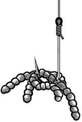 Рис. 3. Насаживание мотыля при ловле леща И последнее. С учетом того что ловля ведется преимущественно на мотыля (рис. 3), вам потребуются прочные крючки из тонкой проволоки очень высокого качества. Размер их от № 15 до № 11. Начинающим лещатникам я бы советовал не экономить на цене крючков. Для леща лучше подходят крючки типа «кристалл». На мой взгляд, среди лучших в мире производителей крючков на сегодняшний день следует назвать такие фирмы, как Owner, Eurostar, Eagle Clow, Gamakatsu, Sumo. (В.А. Казанцев) | |