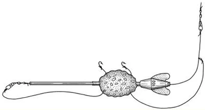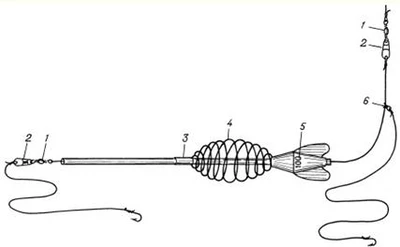 Рис. 1. Ловля с тремя фидерными снастями вдоль свала Незаменимый помощник при ловле с лодки – эхолот. Стаи леща в сентябре плотные, но малоподвижные. Найти их непросто. Подтянуть рыбу прикормкой с дальнего расстояния в это время не удается. Поэтому на поиск лещовых стай, даже при наличии эхолота, может уйти много времени. Если лещ обнаружен, заплывают выше его, ставят лодку на якоря и забрасывают оснастки прямо в место дислокации стаи. В период, когда лещ кормится, уловы могут быть богатые. В сентябре на русловых глубинах вместе с лещом часто удается обнаружить скопления язя, серебряного карася, иногда голавля. В этом случае рыбалка становится не только успешной, но и разнообразной. Лодка располагается носом к течению. Тот якорь, который бросают выше по течению, ставится на вытяжку (с длинным отпуском шнура, запасом которого можно регулировать приближение и удаление лодки относительно места ловли). Кормовой якорь должен опускаться вертикально, иначе при подматывании фидерной оснастки могут быть зацепы. Если летом на Оке крупного леща можно с успехом ловить даже на очень сильном течении, то осенью он обычно выбирает участки с умеренным течением. Здесь корм хорошо вымывается из кормушки, и активная рыба на него быстро подходит. На Верхней Волге, где течение зависит от того, насколько открыта плотина, также лучшее время клева тогда, когда течение усиливается, но лишь до того момента, пока оно еще не достигает максимальной скорости. Некоторые рыболовы специально оборудуют свои лодки под фидерную ловлю: на бортах или корме они закрепляют эстакады для удилищ, монтируют специальные держатели из трубок. С таким оборудованием ловить удобнее и меньше случайных ударов удилищем о борт, что очень важно при ловле осторожного леща. На надувных лодках рыболовы закрепляют для установки удилищ специальные кольца, поперечины. Прибойная ловляВ сентябре с фидером можно довольно успешно ловить в прибойной зоне. Нужно найти такое место, где русло подходит близко к берегу, в сторону которого дует ветер, и ловить прямо под свалом. Самые лучшие для ловли участки располагаются там, где русло проходит от берега в 10–15 м. Такие уловистые зоны есть даже на некоторых водохранилищах. Например, на Можайском водохранилище под Старым селом. Учитывая верхнее (ветровое) и нижнее (отбойное) течение, ловят на границе мути. Обычно лещ и другая рыба стоят не далее 20–23 м от берега и кормятся тем кормом, который несет поток. Рыболову нужно определить зону так называемого равновесия верхового и низового течения и делать туда забросы. При определении точки кормления рыбы эту зону нужно основательно забомбить хорошо вымываемым кормом, а потом перейти на прикормку, которая будет вымываться за 15–20 мин. Для ловли в прибойной зоне нужно ставить на удилище не самый мягкий кончик, иначе волна его будет дергать, что помешает различить поклевку. А поклевки леща в сентябре плавные, нежные, не такие активные, как летом. Чтобы поклевка была виднее, нужно выбирать и соответственный наклон удилища. Оснастка на лещаПримерно одни и те же конструкции кормушек и оснасток я применяю как при ловле с берега, так и с лодки. Раньше я пользовался самодельными рогатыми кормушками (рис. 2). Они более других удобны в обращении, но изготавливать их сложно, а теряются они на дне при зацепах довольно час