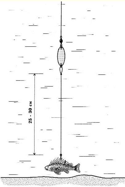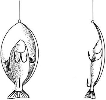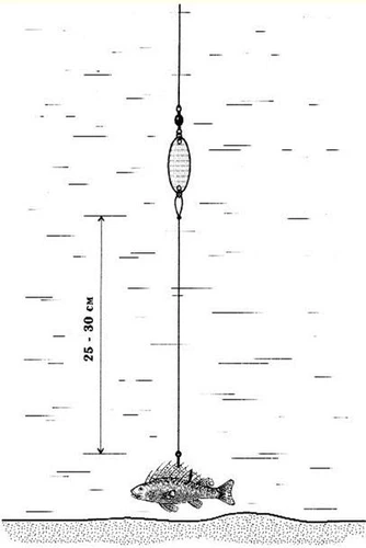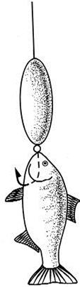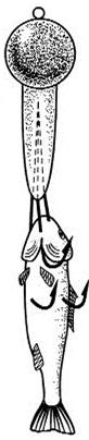 Рис. 1. Блесна с подсадкой мертвой рыбки Если налим берет вяло или если его концентрация в месте ловли невелика, то блеснить без подсадки хвоста или уснувшей рыбки бесполезно. После подсадки уснувшей рыбки в тактике блеснения происходят следующие изменения: сбросив блесну, вершинку удильника прижимают к лунке. Блесна с подсаженной рыбешкой максимально уходит в сторону. После этого медленно, с короткими остановками подтягивают ее к себе. Движение блесны может быть как равномерно-поступательным, так и ускоренным. Наибольший эффект дает подсадка на блесну хвостовой половины или целого свежего, незамерзшего ерша (рис. 1). В отдельных случаях помогает простое шевеление приманкой. Блесну с ершом «ставят» в вертикальное положение, а затем опускают в горизонтальное. В отдельных случаях приносит успех оснастка в которой блесна лишь привлекает внимание хищника, а берет он на ерша (рис. 2). Рис. 2. Вариант оснастки для ловли налима в отвес Нельзя сказать, какие манипуляции с блесной больше раззадоривают хищника, так как в разных случаях налим отдает предпочтение той или иной игре блесны. Если же концентрация налима невелика, то блеснить его всю ночь ради одного – двух экземпляров нет смысла. Проще это сделать с наступлением темноты или ближе к рассвету. Примерно в это же время проверяются и стационарные снасти. Налим на мормышкуВ некоторых случаях эту рыбу интереснее и эффективнее ловить на тяжелую мормышку, подсаживая на крючок хвост или целую рыбешку (рис. 3).