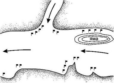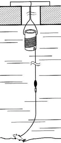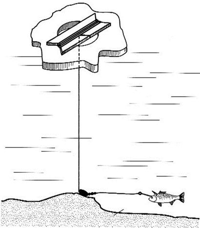 Рис. 7. Установка жерлиц на налима Однако рыболов должен знать, что любое, сверх правил установленное количество снастей является браконьерством. Не имеет смысла использовать леску тоньше 0,4 мм. В большинстве случаев, даже с учетом ограниченного свободного пространства, налим умудряется забиться в укрытие, и его приходится буквально выдергивать оттуда. Тонкая леска может повредиться при трении о камни и порваться при вываживании, а рыба погибнет. Поимка первого налима еще не означает, что рыболову гарантирован стабильный улов. Судить о том, что же найдено – налимья стоянка или «тропа», можно только на следующий день. Если вам удалось обнаружить стоянку, то улов будет весьма впечатляющим. Если же вы напали на «тропу», то он может составить всего одну-две рыбины за несколько суток. Активизация клева наблюдается с 21 до 24 часов и с 3 до 5 часов. В редких случаях налим начинает брать еще засветло, но если ночь ясная и морозная, с яркими звездами и полной луной, то клева может не быть совсем. В этом случае отдельная вспышка его активности иногда наблюдается днем при пасмурной погоде. В водоемах, в которых концентрация налима невелика, и поклевка его даже в «известных» местах случается редко, рыболов целенаправленно вмораживает в лед определенное количество подледных жерлиц. В лед помимо жерлицы вмораживаются ветки, чтобы избежать в этом месте случайного просверливания лунок другими рыболовами. Места установок таких «секретных» жерлиц выглядят в виде еле заметных бугорков, над которыми или в непосредственной близости от которых устанавливаются ориентировочные вешки, понятные только их хозяину. Первоначальную установку подледных снастей производят только в морозную погоду. Проверяют их с помощью специального приспособления. Смысл этой операции заключается в том, что рыбу, пойманную на стационарную жерлицу, извлекают через рядом просверленную, вспомогательную лунку (рис. 8). Естественно, ориентирная вешка, в целях конспирации, устанавливается на некотором расстоянии от лунки. Рис. 8. Проверка стационарной жерлицы Налим на такой снасти остается живым в течение нескольких недель. Разумеется, ловля традиционными спортивными снастями много интересней, но что делать, если налим – этот флегматичный ночной хищник – не хочет считаться с интересами рыболова и вынуждает его на принятие «крайних мер». Насадки на налимаНалима можно поймать на разные насадки животного происхождения, но наиболее эффективной является все же ловля на живца. Лучшие живцы – пескарь и ерш. Эти рыбы ведут такой же донный образ жизни, что и налим, и именно они чаше всего являются его ближайшими соседями. При ловле налимов я неоднократно проводил эксперименты, насаживая на крючок всевозможные типы приманок, и пришел к некоторым выводам. 1. На уснувшую рыбу налим берет гораздо хуже, чем на живую, независимо от того, раздавили вы ее или нет. В каждом регионе существует своя окраска ночного хищника, но общее правило одно: крупные экземпляры всегда более светлые, имеют темно-коричневый оттенок. (А.В. Пышков, С.Г. Смирнов) | |