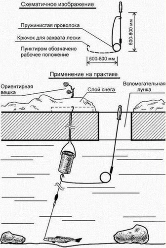 Рис. 4. Простейшая снасточка для налима Налима при плюсовой температуре также ловят на обычную поплавочную удочку, в качестве насадки используя ерша или пескаря. Оснастка поплавочной удочки практически не отличается от оснастки зимнего варианта поставушки с грузилом-«оливкой», лежащим на дне, и поводком из лески длиной до 350–400 мм. Налимья подледная жерлица (поставушка)Все подледные жерлицы (поставушки) делятся на два типа: – с намоткой и жесткой фиксацией лески (налимья снасть лежит на льду, свободный ход лески 0,5–1 м) (рис. 5); Рис. 5. Налимья поставушка – с намоткой и фиксацией лески подо льдом (универсальная жерлица). Свободный ход лески выбирается в зависимости от условий ловли, но редко превышает 1,5–2 м, в противном случае, снасть окажется в коряжнике (рис. 6). Рис. 6. Универсальная поставушка Устройство налимьих жерлиц несложно. Снасть эта компактная и, не боясь перегрузить рыболовный ящик, из дома таких жерлиц можно взять не менее десятка, а наловить зимой за линией камышей, а то и в самих камышах, мелких плотвичек, ершиков для жерлиц – дело не хитрое. Следует отметить, что конструкция в форме мотовила (см. рис. 5) наиболее полно отвечает требованиям, предъявляемым к ловле налима со льда, и является одной из самых рациональных. Поставушка устанавливается в считанные секунды. После определения глубины, по достижению скользящим грузилом дна, с мотовила дополнительно сбрасывается до одного метра лески, и она фиксируется в прорезе. При ловле в «крепких» местах сброс лески производить не следует. Длина поводка не менее 400 мм. Со льда вариант только один: параллельно береговой линии или через каждые 10–15 м в предполагаемом месте налимьей стоянки установить поставушки. Облавливается, как правило, участок береговой линии не менее 250 – 300 м. Тактика поиска такова. С вечера устанавливаются не менее 25–50 поставушек. Утром обычно обнаруживают 1–2 налимов (для водоемов, расположенных не далее 160 км от Москвы, – это удача). В дальнейшем можно ловить только в тех местах, где были пойманы налимы, но устанавливают там уже нормальные жерлицы с сигнализаторами поклевки, то есть с флажками (рис. 7).