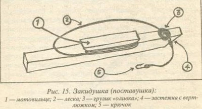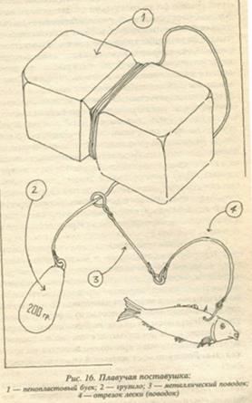 Рис. 2. Плавучая поставушка: Осенней порой для уженья с берега на леску с помощью карабина ставят свинцовый груз весом не менее 100 г. Зимой же груз можно ставить значительно меньше, лишь бы он удерживал на дне живца и не сдвигался течением. К грузу на застежке крепится полуметровый жилковый поводок сечением 0,3 мм с привязанным на конце одинарником № 10-12 или двойником № 8. Опасения, что пойманный налим перетрет своей зубной щеткой поводок, исключаются - таких проделок за ним не водится. Леска может перетереться о нижнюю кромку лунки, но только в том случае, когда очень крупный налим не пролезет в нее, а будет ходить кругами подо льдом. Во всех остальных случаях он становится добычей рыболова. Налим, почуяв и, наконец, схватив добычу, прочь не уплывает, как это наблюдается у щуки или судака, но всегда стоит на месте без движения, неспешно, все глубже и глубже засасывая несчастную жертву в свою утробу. Лишь затем он также неторопливо отправляется дальше по своим делам, постепенно все сильнее заглатывая леску, пока крючок не вопьется в стенки желудка. Ловить налима живцовой снастью в расчете на своевременную подсечку почти невозможно, ибо, как было оговорено, некрупный налим в момент хватки практически не подает никаких сигналов, а в момент обнаружения рыболовом потяжки лески крючок находится уже в чреве хищника. Поэтому данная ловля рассчитана в основном на самозасекание. Хозяину Снастей остается лишь, если он бодрствует, не упустить добычу в крепь, ну а если он сладко почивает, уповать на то, чтобы этого не случилось. При выважи-вании налим упирается чрезвычайно слабо, и порой создается впечатление, будто на крючке находится вовсе не рыба, а какая-то палка или тряпка. Сходов пойманной рыбы не наблюдается. На больших, но относительно спокойных водоемах с октября и до самого ледостава иногда практикуется ночная, бесконтрольная со стороны рыбака ловля налима на кружки и плавучие поставушки. Запас шнура на диске во избежание ухода самозасеченного налима в крепь необходимо зафиксировать путем перехлестывания одного свободного витка вокруг желобка. Груз настороженной снасти должен находиться на дне, ограничивая тем самым свободу передвижения живца, ибо налим подбирает корм, лежащий исключительно на грунте. Поводковое кольцо буйка пропускается на отрезок мачты между его головкой и диском. С той же целью применяются плавучие поставушки (рис. 2), расставляемые с лодки. К свободному концу лески сечением 0,5 мм привязывается груз весом не менее 200 г (можно камень), а на саму жилку свободно надевается короткое коленце жерличного стального поводка, до сих пор еще встречающегося на прилавках рыболовных магазинов. К стальному поводку привязывается отрезок лески сечением 0,3-0,4 мм длиной около полуметра и затем крючок с наживкой. Верхняя часть лески наматывается на пенопластовый ярко окрашенный буек размером чуть больше сигаретной пачки. Как видим, конструкция совершенно примитивная, но позволявшая отдельным рыбакам брать неплохие уловы не только налима, но и речного угря, в свое время густо населявшего воды подмосковного Можайского моря. Ввиду малочисленности налимьего поголовья в Московской области вряд ли найдутся рыбаки, специализирующиеся именно на одном этом уженьи. Обычно ловля налимов производится в совокупности с ловлей других рыб. На