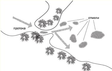 Рис. 1. Традиционные окуневые стоянки в проточных озерах Летом ситуация несколько иная. Отнерестившийся окунь какое-то время не отходит от мест икромета. Затем разбредается по всему водоему в поисках скоплений кормовой рыбы и другой живности. Часто его можно встретить в прибрежных коряжниках, где уместнее всего применять незацепляющиеся приманки. При жаркой погоде следует учитывать, что в стоячих и малопроточных водоемах его поведение во многом определяется термоклином, когда происходит расслоение воды на холодную и очень теплую. В этой ситуации окунь выбирает слой воды, где он чувствует себя более комфортно. Найти этот слой можно с помощью термометра или эхолота. Но чаще всего стаю окуней удается обнаружить, делая проводку приманки в различных уровнях. В осенние дни окунь ведет себя, пожалуй, наиболее активно, за исключением периодов затяжных дождей и резких похолоданий. Практика показывает, что хищника можно ловить вплоть до ледостава, и чем ближе к зиме, тем на большей глубине, где вода охлаждается не столь резко, как на мелководьях. В это время вам понадобятся приманки для глубоководной проводки. (В.А. Казанцев) | |