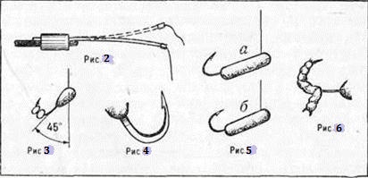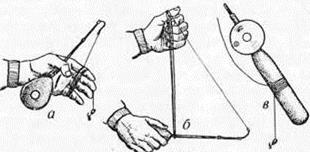 Рис. 7. Способы переноса снасти: а — одной рукой; б — двумя руками; в — намотанной на ручку удильника