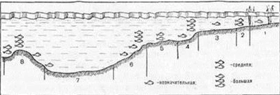 Для рыболовов-спортсменов летом уклейка, а зимой окунь — главные объекты добычи. Пожалуй, ни одно зимнее соревнование не обходится без ловли окуня. Вот почему 80 процентов своего тренировочного времени спортсмены посвящают освоению ужения этой рыбы. Основная масса любителей тоже ловит полосатого хищника. Испытывая постоянно давление со стороны рыболовной братии, окунь с годами, если можно так выразиться, набирается опыта, становится хитрее. В свою очередь, спортсмены и передовой отряд любителей оттачивают технику и тактику ловли, ищут новые приемы. Чтобы составить тактический план тренировки или соревнования, спортсмен должен иметь максимум сведений об образе жизни и повадках окуня. Спортсмену необходимо знать: I.Наиболее вероятные места обитания, сезонные и суточные миграции окуня. Зоны для соревнований разбиваются обычно по береговой полосе, а окунь в большей степени, чем многие другие виды рыб, привязан к берегу, точнее — к мелководью. Поэтому надо знать, в какой части прибрежных вод он кормится в данное время года и суток. На рис. 1 показаны наиболее характерные места и плотность стоянки (жировки) окуня. Рис. 1. Плотность концентрации окуня в зависимости от рельефа дна Зона 1 — окна среди зарослей водной растительности. Окунь стоит здесь, если глубина превышает 0,5 м, лед матовый или покрыт снегом. Обычно это бывает в начале сезона (по первому льду). С понижением уровня воды и началом отмирания и гниения водорослей окунь покидает зону. Зона 2 — у кромки водной растительности. Окунь стоит в таких местах по первому и последнему льду. Зона 3 — ровный участок дна с незначительным понижением, куда окунь выходит на кормежку только утром на короткое время. Зона 4 — мелководный свал. Наиболее интересный участок. Здесь окунь часто стоит в течение всего дня. Зона 5 — бугристое дно. Тоже излюбленное место стоянки и жировки окуня. Зона 6 — глубинный свал: затопленное русло речки, овраг, карьер и т. п. Тут можно встретить крупного окуня. Зона 7 —само русло. Здесь окунь обычно не держится, русло занято другими видами рыб. Зона 8 — подводные бугры или вершины скатов, находящиеся вдалеке от берега. Излюбленные стоянки окуня в период всего сезона, особенно в яркие солнечные дни. На рисунке не обозначены коряжники, каменистые укрытия, выбоины на дне, затопленные дороги, мысы и т. п. — постоянные места нахождения окуня. Не показаны эти участки потому, что уловистые места обычно заняты любителями, а зону для соревнований, как правило, разбивают на малопосещаемых любителями местах. К тому же зоны должны быть однородными по условиям ловли. Если, например, одну из зон пересекает затопленное русло реки, а остальные разбиты на ровном плато, то это вызовет недовольство у спортсменов, хотя неидентичность зон правилами соревнований допускается. При выборе места ловли следует учитывать дневные миграции окуня, особенно ощутимые в весенние дни, когда солнце поднимается все выше и освещенность воды резко возрастает. В это время окунь, по-видимому, боясь яркого света, перемещается с мели на глубину, туда, где темнее, безопаснее, и продолжает кормиться. На мели же поклевки его могут совсем прекратиться. II. Плотность скопления рыбы на данном участке водоема. От плотности скопления рыбы в зоне зависит теми ловли — частота смены лунок. Чем больше голодной рыбы в зоне л