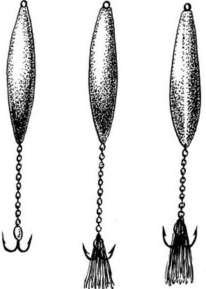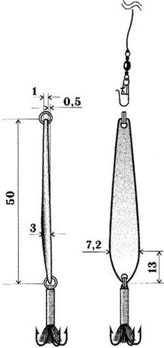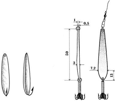 Рис. 9. Перемещение окуневой блесны после сброса А потому опытные рыболовы сообразуют свои движения удильником с «пожеланиями» окуней. А «пожелания» эти определяются опытным путем. Нет необходимости непрестанно дергать удильник. Два-три раза подняв блесну, целесообразно некоторое время просто медленно покачать ею у самого дна и постучать о дно. Снова приподнять... Полезно удильник, применяемый для блеснения, оборудовать еще и пружинистым кивком. Иной раз поиграть блесной так, как это делают мормышкой, приносит желаемый результат. И еще один из советов, рожденных многолетней практикой рыболовов: в пасмурную погоду эффективнее блесны из белого металла, а в яркий солнечный день успешнее применение блесен тусклых или изготовленных из меди, латуни и т.д. На рис. 10 показаны блесны, привлекающая полосатого, на Истринском, Рузском и Озерниском водохранилищах. а)