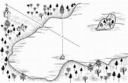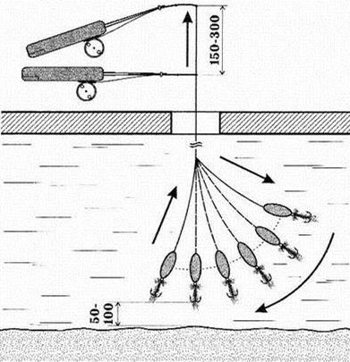 Как только на водоемах встает первый лед, начинается увлекательная ловля окуня. Окуневые стаи, как правило, в самом начале зимы держатся на мелководных участках, в начале берегового свала, рядом с зарослями тростника и осоки, а также в непосредственной близости от водной растительности, редко выходя на глубину. Если рыболову первому удается «засверлить» перспективный участок в береговой зоне, клев почти всегда обеспечен. Полосатый по перволедью практически не покидает свои стоянки и уходит от берега по мере нарастания льда. Окунь клюет активно, жадно. Из одной лунки порой удается выловить несколько десятков мерных рыбин. Хотя и по первому льду поиск необходим, так как наткнувшись на мелкого окуня, можно продолжать ловить его в течение суток, без шанса поймать солидные экземпляры. Клев окуня по перволедью происходит по следующей схеме: рыболов опускает мормышку, но она как бы зависает в толще воды и не желает идти ко дну. На самом деле, она давно уже в пасти прожорливого хищника и вынуть ее оттуда бывает нелегко. Подобные поклевки происходят и по последнему льду, но гораздо реже. В середине зимы окуня приходится искать по всему водоему. Окуневые стаи перестают перемещаться по большой площади и дробятся на небольшие стайки, численность которых редко превышает 5–7 особей. Для успешного ведения поиска рыболов должен уметь ориентироваться на водоеме и безошибочно находить ранее отмеченные места (рис. 1). Рис. 1. Нахождение места ловли по береговым ориентирам В большинстве замкнутых водоемов клев становится капризным и непредсказуемым. В январе – феврале окуневые стоянки рыболов должен знать с точностью до метра, поскольку вести поиск по глубокому снегу, постоянно засверливая толстый лед практически невозможно. При нормальном кислородном режиме окуневые стаи чаще всего занимают верхние границы береговых свалов, затопленных оврагов, старых русел, предпочитая места с твердым, покрытым коряжником дном, рядом с местом стоянок стаек мелкой рыбешки. Впрочем, окунь-недомерок или, как его иногда называют «матросик», всю зиму может крутиться в береговой зоне рядом с зарослями тростника. Он представляет интерес только для спортсменов и в качестве живца. Снасти на окуняУдочкиНаиболее рационально ловить окуня на мормышку. В начале зимы и по последнему льду его привлекает активная игра с высокой частотой и большой амплитудой. В середине зимы амплитуда резко снижается, поклевки могут наблюдаться при остановке приманки. В отдельные периоды окунь берет только на спокойно лежащую на дне мормышку или крючок с насадкой. Поэтому и ловить его приходится на поплавочную удочку, но это скорее исключение. Как правило, используются удочки со встроенной внутрь корпуса катушкой («балалайкой») (рис. 2).