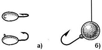 Рис. 3. Мормышки:а) «овсинка»; б) «дробинка» Удлиненные мормышки начинают планировать, у них наблюдается так называемый «маятниковый эффект», скорее отпугивающий окуня, чем привлекающий. Поэтому наиболее распространены мормышки в форме шара, сферы, прямоугольника, усеченной пирамиды или цилиндра. Дополнительный эффект наблюдается, если верхняя часть мормышки медная или латунная. Всю зиму окунь охотно берет на вертикальные мормышки типа «чертик» миниатюрных размеров. Максимальный диаметр редко превышает 3,5–4 мм, высота с крючками 5–7 мм. Внешняя оболочка, заливаемая вместе с крючками, свинцом или нижняя часть мормышки должна быть медной или латунной. На крупные вертикальные мормышки окунь практически не берет. Так, даже на среднего «чертика» высотой 15 мм, предназначенного для ловли леща, возможна поклевка только матерого «горбача». ИграОкунь реагирует на мормышку, когда она перемещается в придонном слое подобно челноку, совершая довольно резкие движения (скачки) как в горизонтальной, так и в вертикальной плоскостях, но при этом незначительно отклоняясь от вертикальной оси. В отдельные периоды окунь реагирует только на дрожащую, зависающую в одной точке приманку. Движение мормышки в этом случае очень напоминает игру безнасадочной приманки, с той лишь разницей, что подсадка мотыля на нее обязательна. Такая игра отпугивает большинство рыб семейства карповые даже в период максимального жора. Поэтому очень часто два рыболова, находящиеся недалеко друг от друга, но по-разному играющие мормышкой, ловят разную рыбу. По мере ухудшения кислородного режима окунь становится очень разборчивым: реагирует только на вялое шевеление приманки, в отдельных случаях его интересует только ее полная остановка. В глухозимье окунь на леску диаметром более 0,1 мм и на мормышку весом более 1,5 г. клевать отказывается. Или берет приманку так нежно, что грубая снасть не фиксирует поклевки. Игра мормышкой не должна быть однообразной. Среди наиболее опытных рыболовов, охотящихся на окуня, есть подлинные мастера, которые обрели такую технику «игры» мормышкой, научились придавать ей такую частоту движения (до 300 колебаний в минуту), что окунь хватает ее даже без насадки. Это уже «высший пилотаж». Но даже не обладая такой техникой лова, при редких поклевках, нелишне попробовать разные варианты «игры» приманкой. Как-то на льду рыбачил я невдалеке от двух рыболовов и невольно наблюдал за ними. Рыболовы уж так устроены, что не могут не наблюдать друг за другом. Так вот один из моих соседей распустил три удочки, а второй ловил одной, не выпуская ее из рук. Примерно за час тот, кто ловил тремя удочками, вытащил одну плотвичку и пару окушков, а другой успел натаскать из одной лунки за то же время, по меньшей мере, десятка полтора окуней. Видел я среди его трофеев очень неплохие экземпляры. В чем же дело? Вроде как и снасти одинаковые, насаживали и тот и другой на крючок мотылей... Ответ на этот вопрос вы можете получить, наблюдая жизнь в домашнем аквариуме. Обратите внимание на то, как ведут себя выпущенные туда на корм рыбкам дафнии или мелкий мотыль. Они непрестанно двигаются. Причем не плывут спокойно из одного угла аквариума в другой, а как бы толкутся на одном месте. Их движения быстры и хаотичны. Так же ведут себя и мальки. А ведь и дафнии, и мотыль, и мальки – это и ес
