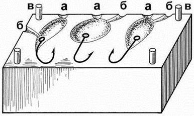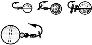 Рис. 7. Оснастка мормышек: бисером, кембриками, хлорвиниловыми колечками Помогают привлечь окуня колечки красного, желтого, зеленого цвета... Повышают эффективность мормышки красные шерстинки, подвязанные к цевью крючка, но так, чтобы они на закрывали его бородки и не были чрезмерно пушистыми, мешающими «игре» мормышки. Обычная свинцовая приманка выигрывает, если покрасить в черный цвет цевье крючка и в красный – кончик мормышки. Двухмормышечной снастью можно с успехом ловить в период перволедья. Причем довольно часто окуни одновременно садятся сразу на две мормышки. Сам способ лова несложен. Насадив на крючки мормышек приманку, снасть опускают под лед. Лучшей, не имеющей альтернативы приманкой при ловле на мормышечную снасть окуня служит мотыль (личинка комара). Для привлечения по первому льду крупного окуня насаживают по три-четыре личинки на каждый крючок. Самый лучший способ – подцеплять мотыля крючком чуть ниже черной головки. Если протыкать его тельце еще ниже, то мотыль, что называется, вытечет, от него останется одна красная шкурка. Правда, в пору активного клева «работает» и такая насадка. При отсутствии мотыля, его с успехом можно заменить тонкими ленточками свежей свинины. Нарезают их от кусочка мяса, если резать не поперек, а вдоль волокон. Длина полосок такая, как длина самой личинки, примерно – один сантиметр, а толщина – чем тоньше, том лучше, не толще, чем один миллиметр. Такая насадка вполне заменяет мотыль. Очень привлекательной для окуня насадкой оказывается чернобыльник. Его добывают в стеблях чертополоха, репейника и других трубчатых высоких растений. В мякоти их стеблей зимуют очень мелкие белые личинки. Для их добычи стебель разрезается вдоль ножом, и из мякоти извлекаются эти самые личинки. Нацепить их возможно только на самый тонкий крючок: так они мелки. Насаживают по четыре-пять штук, и окунь их своим вниманием не обходит. Неплохо «работают» они и в сочетании с подсаженным к ним мотылем. Хороша эта насадка и тем, что добыть ее не составляет труда в течение всей зимы на городских пустырях, по берегам канав, в садах и огородах. Можно насаживать и мелкие кусочки рыбьего филе, глаз окуня, рыбьи потрошки, навозного червя. Только все эти варианты в меньшей степени привлекательны для окуня. Не против он полакомиться и «бутербродом», который ему предлагает рыболов в виде насаженных на крючок вместе мотыля и опарыша (личинка мухи). Неплохо таким «бутербродом» оснастить нижнюю мормышку, а наверх нацепить мотыля... Опустив снасть до дна, рыболов подматывает на катушки излишек лесы, а затем мелкими движениями начинает поддергивать мормышку. Опытные рыболовы умеют придавать ей такую частоту движений, что мормышка как бы дрожит около дна, а рыболов одновременно очень медленно поднимает снасть на 20–30 сантиметров от дна. Затем вновь дает ей возможность опуститься до дна и повторяет маневр. Поклевка выражается в движении сторожка вниз: плавном (при поклевке крупного окуня), а чаще резком и быстром – это при поклевке травяника. Подсечка следует незамедлительно. Вытаскивают окуня, перебирая леску рукой и сбрасывая ее на лед по ветру. Когда окунь покажется из воды, стоит тут же прихватить его рукой. Если этого не сделать, то даже 200-граммовый окунек, поднятый на тонкой жилке, может ее оборвать. Многие рыболовы ловят на две