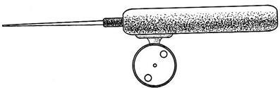 Рис. 6. Форма для отливки мормышек Кисточкой уберите из формы малейшие крошки алебастра, уложите в форму на свои места крючки. Осталось сложить обе половинки и форма готова. При изготовлении формы не стоит рассчитывать ее на большое количество отливок. Оптимальный вариант – 2–3 мормышки. При их большем количестве могут возникнуть проблемы: форма начнет крошиться, в литник начнут попадать кусочки шлака... Теперь о самом процессе литья. Свинец перед расплавлением надо нарубить мелкими кусочками. Положить их в заранее заготовленный для этой цели тигель, поставить его на плиту. Минут через пятнадцать свинец расплавится. Форма к этому времени должна быть собрана и скреплена снаружи проволокой. Аккуратно, тонкой струйкой залейте свинец в каждый литник, дайте металлу в форме застыть. Минуты через две раскройте форму – ваши мормышки готовы. Останется только убрать напильником излишки свинца и стальной иголкой при помощи молотка пробить отверстия для жилки. Мормышки можно, по своему усмотрению, оставить такими, какие они есть, а можно раскрасить краской. Маленькие хитростиПривлекательность мормышки для окуня, как показывает практика, повышают нанизанные на цевье крючка колечки из цветной изоляции тонкого радиопровода (рис. 7). На разных водоемах и в разное время путем подбора следует насаживать на цевье разные цветовые комбинации этих колечек. Они вырезаются из изоляции не толще миллиметра и по ширине в полмиллиметра, можно и тоньше.