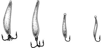 Рис. 4. Удильник с катушкой В редких случаях применяется и снасть поплавочная. Обычно это делается так. Рыболов опускает в лунку поплавочную снасть, чаще всего с наживленным на крючок мотылем. А рядом, в другой лунке, ловит окуня на мормышку, следя одновременно и за поплавком. Я наблюдал за такой ловлей. Пробовал и сам ловить таким образом. Случалось, что на поплавочную удочку изредка клевал окунь, причем, как правило, не из числа «матросиков». И все-таки такая рыбалка едва ли может быть успешной. Дело в том, что поклевки окуня на неподвижную насадку как летом, так и зимой бывают крайне редко, а мелкий ерш, из тех, что в спичечный коробок можно уместить десяток, на мотыля клюет непрестанно. Вот и получается, что вместо того, чтобы играть мормышкой, сосредоточив свое внимание на сторожке, рыболов то и дело вынужден хвататься за поплавочную удочку. Опытный рыболов охотится на окуня с одной удочкой – либо мормышечной, либо с блесной (рис. 5). Рис. 5. Окуневые блесны Есть, правда, еще один вполне оправданный вариант. Во льду высверливаются две лунки на расстоянии друг от друга не менее полутора метров (иначе возможен перехлест снастей). В одной лунке ловят мормышечной снастью, в другую опускается зимняя окуневая блесенка. Перед тем как начать ловлю на мормышку, рыболов «играет» блесной. Это может привлечь окуня. Если нет поклевок на блесну, начинают «играть» мормышкой и окунь, привлеченный блесной, но почему-то ею пренебрегший, не устоит перед искушением схватить мормышку с мотылем. Если дело пошло, опущенная на дно блесна там и будет оставаться. Кончился клев, можно будет снова подразнить окуня блесной. Правомерен вопрос, а зачем рыболову много удочек? Во-первых, если произойдет обрыв жилки, а такое случается довольно часто, особенно у новичков, то заново оснащать удочку на морозе, да еще при хорошем клеве – это беда! Лучше убрать пострадавшую удочку в ящик и начать ловлю запасной. А во-вторых, надо еще иметь при себе и удочку, заранее оснащенную жилкой потолще и блесной, вдруг крупный окунь объявится! Четвертая удочка – на тот случай, если обрыв повторится. Это вполне может произойти, потому что зимой используются самые тонкие лески. Если ловля идет на мормышку или на обычный крючок, жилку ставят от 0,08 до 0,15 мм. Причем, как это ни странно, но даже сотые доли миллиметра влияют на частоту поклевок. Чем тоньше жилка, тем больше поклевок. Зимой толщина жилки очень заметно влияет на результат рыбалки. Среди рыболовов-окушатников встречал я и таких, которые пользуются миниатюрными удочками без катушек, наматывают жилку на укрепленные на рукоятке удилища маленькие мотовильца. Для зимней рыбалки запас жилки на катушке или на мотовильцах в 5–10 метров вполне достаточен. Это с большим запасом на всякий случай. Отказ от катушки обусловливается опять-таки желанием, сделать удочку компактной, занимающей как можно меньше места. И все-таки, снасть с катушкой много удобней. Ей можно быстрее и предельно точно установить требующуюся для ловли длину лесы, С катушкой сподручней и быстрее можно смотать жилку. Это особенно важно рыболову, охотящемуся за окунем. Ему надо искать свою добычу, часто меняя место, то и дело совершая переходы. Конечно, смотать жилку на катушку, куда как быстрее и проще, чем на мотовильца. О длине удильника. Она должна быть такой, чтобы при подсе