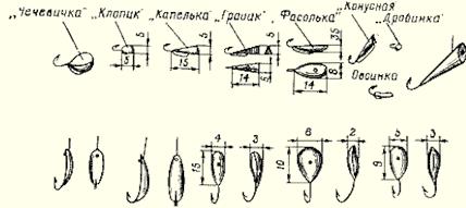 Рис. 4. Уловистые блесны: а — с малым крючком для насадки б — с пружинкой для насадки При ловле крупных окуней лунки можно затемнить снегом, оставляя лишь маленькие отверстия для свободного движения лесы. В морозное время необходимо систематически очищать лесу от ледяного наслоения, которое может препятствовать игре блесны. Хотелось бы порекомендовать зимним рыболовам, увлекающимся ловлей только на мормышку, освоить технику ловли блесной. Этот способ не менее спортивен, чем способ ловли на мормышку. При том на блесну часто попадает щука, а иногда и судак. Ловля окуня на мормышкуВо время соревнований наших рыболовов с финскими рыбаками, которые всегда считались искусными мастерами в ловле окуней на блесну, победу одержала наша русская мормышка. Видимо, маленькая мормышка своим активным движением больше действует на хищнический, а не на инстинкт питания окуня. В этом легко убедиться, если сравнить ловлю на обычную удочку с ловлей на мормышку (с одной и той же насадкой — мотылем). Лучший результат даст мормышка. При слабом клеве окунь на мормышку берет лучше, чем на блесну. Кроме того, способ ловли на мормышку с мотылем освоить гораздо легче, чем на блесну. На мормышку можно ловить и других рыб. Все эти преимущества и способствовали широкому распространению мормышки. У московских рыболовов мормышка появилась в 1930–1931 гг. Придумана она была неизвестно кем: москвичами или уральцами. Но, судя по тому, что уральские рыболовы давно пользовались маленькими блеснами, похожими на современные мормышки, надо полагать, что и мормышка была завезена с Урала. Однако название «мормышка» дали московские рыболовы, так как на Урале и в Сибири слово «мормышка» в то время не бытовало. Мормышки (рис. 5) различаются по форме, цвету, металлу и величине. У многих рыболовов есть любимые формы мормышек. И каждый из них считает, что его мормышка лучше, уловистее других. Но проходит некоторое время, и однажды на рыбалке рыболов замечает, что сосед облавливает его на мормышку другой формы. Увидев новую мормышку, рыболов успокоится лишь тогда, когда сделает себе такую же. Проходит еще год. Наш рыболов попадает в другой район. И на незнакомом водоеме он видит, как местные рыболовы на блесны и на крупные свинцовые мормышки ловят крупных окуней. «Ну, — думает рыболов, — я им покажу, как надо ловить». Насадил на маленькую мормышку мотыля и стал ловить. Но не тут-то было. На его мормышку ловилась только мелочь даже в лунках, откуда местные рыболовы вылавливали горбачей. Тогда наш рыболов покупает пару крупных свинцовых мормышек и довольно успешно ловит на них крупных окуней. Вернувшись домой, в первый же выходной день едет на рыбалку. «Вот теперь, — думает он, — я покажу нашим рыболовам класс рыбалки, как надо ловить крупных окуней». Но ему опять не повезло. Окунь здесь ловился на маленькую мормышку величиной с булавочную головку — на дробинку. Рис. 5. Мормышки Все это говорит о том, что при подборе и определении уловистой мормышки надо исходить из типа водоема, его географического положения и из того, как посещается водоем рыболовами. Например, в первом случае окунь ловится на более грубую снасть и на крупную мормышку, во втором случае, где у окуня выработался защитный рефлекс, надо применять мелкую мормышку и тонкую лесу, кроме того, рыболову следует еще и подбирать наса