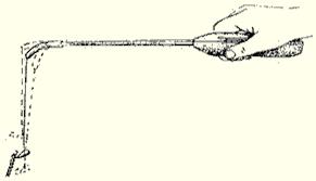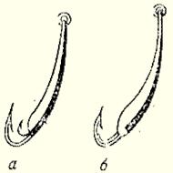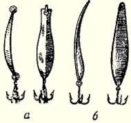 Рис. 3. Окуневые блесны: а — Серикова; б — Канцера Рыболову следует знать еще и такое правило: при оснастке удильника легкой блесной лучше применять тонкую лесу; толстая из-за большой плавучести будет тормозить ход блесны и сделает ее неуловистой. Иногда одинаковые на вид блесны дают различные результаты. Причиной этого являются незаметные на первый взгляд отклонения в распределении олова. Вот почему для улучшения «игры» блесны надо либо регулировать ее изгиб, либо прибавлять или удалять часть олова. Уловистость блесны зависит и от ее цвета (но в меньшей степени, чем от ее «игры»), а также от яркости блесны. Например, на посеребренную блесну окунь берет лучше, чем на никелированную, хотя она кажется ярче. В одних водоемах окунь хорошо ловится на свинцовые блесны, в других на латунные или медные. Иногда он лучше клюет на ярко начищенные, а иногда — на тусклые блесны. При покупке или изготовлении блесен особое внимание надо обратить на то, чтобы крючок был посажен на блесну под углом 30°. Такое положение крючка обеспечивает лучшую подсечку окуня. При хорошем клеве, когда нет необходимости в насадке, лучше пользоваться крючком без зазубрины в жале — это ускоряет процесс ловли. Вместо крючка к блесне можно припаять иголку, придав ей нужную форму. С иглообразным крючком можно ловить, не снимая рукавиц. При слабом клеве большое значение имеет и цвет крючка. Практика подтверждает, что золотистый крючок более уловистый, чем черный. Наилучшие результаты дает блесна, которая оснащена небольшим подвесным тройником. В дополнение к «игре» блесны немалую роль играют колебания тройничка с красной шерстинкой. Хорошие результаты при отвесном блеснении окуня дает подвесной крючок. Иногда неплохо окуневую блесну дополнительно оснастить поводком длиной 3 см и одинарным крючком. Поводок с крючком привязывают к крючку блесны, а на крючок с поводком насаживают кусочек червя или мотыля. Техника ловли такая же, как при обычном блеснении окуня, но пауза между опусканием блесны и ее подъемом увеличивается до 3 секунд. Важна также и оснастка удильника. Легкий и удобный в обращении удильник обеспечивает успешную ловлю. При оснастке удильника следует обратить внимание на подбор сторожка: его длина должна соответствовать тяжести блесны. Так же, как и при ловле на мормышку, лучшим сторожком для блеснения окуней является ниппельная резинка. Она крепит лесу к удильнику, сигнализирует о поклевке. Чем тяжелее блесна, тем короче должна быть резинка. При опускании блесны резинка должна не провисать, а идти под небольшим уклоном вниз. Блесну привязывают к лесе простым узлом, который после затяжки узла служит задержкой. Перед тем как завязать узел, концы лесы надо подержать несколько минут в горячей воде. Это намного увеличивает прочность лесы в месте узла. Техника ловли блеснойКакой бы уловистой блесна ни была, но без правильной техники рыболову не будет сопутствовать успех. Некоторые авторы рыболовной литературы считают, что техника блеснения не сложна. Это не совсем так. В процессе обучения рыболова ловле окуня на блесну и на мормышку установлено, что ловлю на мормышку с мотылем начинающий рыболов осваивает быстрее, чем ловлю на блесну. Техника блеснения окуней заключается в умении действовать удильником. Опустив блесну до дна, ее приподнимают на 10 см и ловя
