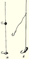 Рис. 7. Привязывание на лесу мормышек: а — двух; б — тяжелой мормышки и крючка Техника безмотыльного лова такова: опускают мормышку на дно. Затем частым содроганием удильника через сторожок придают такие же содрогания мормышке и ведут ее вверх на 60–80 см. Сделав секундную паузу, энергично опускают мормышку вниз. Движения повторяются 10–15 раз. Обычно окунь не выдерживает таких движений мормышки и нападает на нее. Если после этого не последует поклевки, надо сменить лунку. Во время движения мормышки вверх рыболов должен внимательно следить за сторожком, так как малейшее его смещение вверх, вниз или остановка означают поклевку, а значит, должна последовать немедленная подсечка. Голую мормышку при промедлении с подсечкой окунь мгновенно выбрасывает. При прекращении клева окуня на мормышку без мотыля надо попытаться ловить его с мотылем или другой насадкой. Случается, что из одной и той же лунки окунь лучше берет то без мотыля, то с мотылем. Я знаю рыболовов, которые выезжали на рыбалку без насадки, и результаты лова у них были неплохие, но были и такие случаи, когда рыболовы, применявшие насадки, ловили успешно, а «безмотылыцики» возвращались с рыбалки пустыми. У окуня, как и у других рыб, вкусы меняются часто. Сегодня окунь ловится на мормышку, а завтра только на малька или другую насадку. Замечено, что и насадкой каждый раз надо пользоваться по-разному. Один раз окунь лучше ловится, когда на крючок мормышки насажен только один мотылек. В другой раз он лучше берет насадку из нескольких мотыльков. Имеет значение и сам способ насадки на крючок мормышки. Замечено, что окунь лучше берет мотыля, насаженного на крючок мормышки чулочком или колечком, хуже — насаженного за головку. Иногда окунь лучше ловится, когда на крючок мормышки насажена лишь одна головка мотыля. Часты случаи, когда из одной и той же лунки окунь берет с перерывами. По-видимому, он привыкает к мормышке и перестает ее брать, но достаточно дать лунке «отдохнуть», как окунь в ней опять клюет. Иногда в процессе ловли выясняется, что на самую уловистую мормышку окунь совсем перестает брать, а берет на какую-нибудь зеленую или красную мормышку. В ловле всякое бывает. Поэтому во всех случаях большое значение имеет наблюдательность рыболова, его активность не только в отыскании стоянок окуня, но и в подборе на данный момент «желанной» для окуня насадки, подходящей формы мормышки и способа ловли. Большое значение в технике ловли окуня имеет своевременная подсечка. Она не должна быть очень резкой, так как при поклевке крупного окуня неизбежен обрыв лесы. Немаловажную роль играет умение вываживать крупных окуней. Лесу надо выбирать осторожно и при толчках окуня давать ему ход, слегка притормаживая большим и указательным пальцами лесу. Из лунки крупного окуня надо вынимать багориком или рукой, но не поднимать его за лесу. В сильный ветер и мороз, особенно при ловле на глубине, чтобы леса не цеплялась за лед и не рвалась, надо очищать около лунки площадку от кусочков льда, появившихся в результате просверливания лунки, а лесу периодически освобождать от неизбежного наслоения льда. Важное значение при ловле окуня имеет насадка. Выбор ее зависит от кормовой базы данного водоема и сезона ловли окуня. Весной окунь лучше берет на червя, летом — на малька. У окуня вкус меняется не только по с