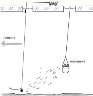 Плотва обладает хорошо развитым обонянием. С учетом этого следует применять пахучие прикормки. Если, скажем, окуня на протяжении всей зимы можно ловить, не прикармливая лунки, то с плотвой этот номер обычно не проходит. Исключение – ловля по первому и последнему льду, когда эта рыба устремляется из водохранилищ и озер в реки. В зимний период, как, впрочем, и в летний, лучше всего использовать фирменные прикормки типа Sensas. Ну а за неимением их можно обойтись пшеничными (панировочными) сухарями, перемешанными с поджареными и молотыми семенами подсолнуха. Там, где мало или вовсе нет ерша, можно с успехом прикармливать плотву мелким кормовым мотылем. Часть его (опять же для запаха) следует придавить. Опускают мотыля время от времени небольшими порциями с помощью миниатюрной кормушки. Рыба обычно подходит через 15—20 минут. Бросать щепотками мотыля в лунку следует лишь в том случае, когда нет течения. При ловле на течении кормушку открывать следует, когда она опустится на дно. При докармливании в процессе ловли кормушку открывают примерно в метре от дна. А чтобы течением не сносило корм ниже точки ловли, его опускают из вспомогательной лунки (рис. 1).