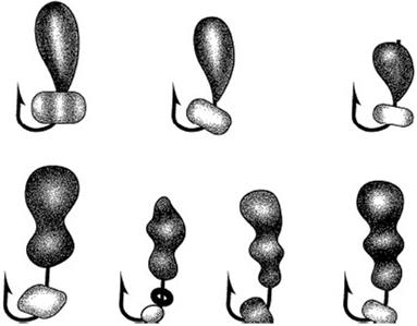 Рис. 5. Мормышки с бусинками, предназначенные для безнасадочной ловли По первому и последнему льду предпочтение надо отдать, безусловно, мормышке (рис. 4, 5). Форма и цвет ее определяются глубиной ловли, освещенностью подо льдом, видом насадки, но главное – экспериментально. Неплохо оснастить мормышку кембриками или бусинками в таком сочетании цветов: белый-черный-белый. Нужно всегда иметь при себе набор различных мормышек. Если блеск мормышки отпугивает плотву, замените приманку на тусклый или матово-черный цвет. В разных водоемах условия ужения различны, а поведение рыбы нестандартно. Но есть и общие закономерности. Мелкая плотва обязательно «дегустирует» насадку, долго теребит, отчего кивок часто-часто вздрагивает. Крупная плотва обычно берет с ходу, в результате чего кивок «делает поклон» и тут же поднимается. Если он выпрямился до конца и вы не успели сделать подсечку, рыба может почувствовать неестественность приманки и выплюнуть ее. Несколько иначе выглядят поклевки при ловле на поплавок и мормышку. В этом случае обычно плотва лишь на какой-то миг слегка приподнимает поплавок, и в этот момент надо успеть сделать короткую подсечку. Насадка на плотвуТеперь выясним, что плотве по вкусу, против какого лакомства она не устоит. Насадка должна привлекать внешним видом, цветом и запахом, надеваться аккуратно на крючок. Выбор ее в каждом конкретном случае зависит от характера водоема, его кормовой базы, времени года, а иногда и суток. Самая распространенная зимняя насадка на водоемах средней полосы России – мотыль. При слабом клеве выручает «бутерброд» – мотыль с 1–2 личинками репейной моли. В некоторых водоемах, особенно в западных и южных регионах России, плотва клюет на хлеб, тесто, кашу из манной крупы, геркулес и даже плавленый сыр. Сибирские рыболовы применяют мормыша. Тактика ловли плотвыПлотва требует от рыболова нестандартных действий. Хотя эту рыбу, как и окуня, можно встретить в большинстве наших водоемов, всякий раз приходится проявлять смекалку, приспосабливаться к местным условиям. Допустим, среди зимы вы приехали на водоем, где есть плотва. В это время она придерживается довольно глубоких ям с песчано-илистым или глинистым дном. Места плотвиных стоянок надо знать, из года в год они практически одни и те же. А вот на незнакомом водоеме их приходится искать методом проб. В этом случае с помощью глубомера или эхолота стараются найти «стол» – перепад глубины с 3–5 до 7 м. Сверлят лунки на разной глубине, затем обязательно их подкармливают. (В.А. Казанцев) | |