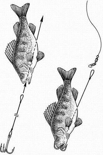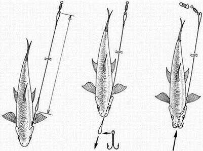 б) Рис. 2. Варианты насаживания живцов: а) под жаберную крышку; б) сквозное продевание Крупный живец, особенно плотва, аккуратно насаженная на снасточку, не теряет подвижности несколько суток. Щука на него засекается самопроизвольно, сходов практически не бывает. Несмотря на то, что эти способы насадки живца были описаны Л. Сабанеевым много лет назад, они не потеряли своей актуальности и по сей день. Для рыболова главное – вовремя и умело воспользоваться ими на практике. При ловле в нормальных условиях (нет сильного течения, нет сплошного коряжника) применяется «классический» способ насадки живца под спинку. Тройник используют в зависимости от размеров живца, но редко больше, чем № 8–10 по отеч. нумерации. Как показывает практика, в каком бы месте вы ни ловили, совершенно чистого дна не бывает. Необходимо всегда находиться рядом с жерлицами, пристально наблюдая за ними. Если рыболов намеренно ловит в коряжнике жерлицами, не приспособленными для этой цели, то удачей заканчиваются поклевки, произошедшие только на его глазах. Если рыболов прозевал момент поклевки, вытащить желанный трофей у него всего процентов 15, не больше. Применение металлического поводка для ловли щук – на многих водоемах вопрос не однозначный, но при ловле в коряжнике без него не обойтись, так как хищника, несмотря на все ухищрения, все равно приходится вытаскивать из непроходимых свалов, а давление щучьих зубов на леску в этом случае увеличивается в 3–4 раза. На жерлицы на щуку в рекахВ дальнейшем при ловле щуки нужно учитывать одну интересную особенность рек – их густо заросшую водорослями береговую зону в местах со слабым течением. При хорошем кислородном режиме водоросли практически не гниют, являясь источником корма и одновременно укрытием для многих рыб в течение всего зимнего периода. Именно этим объясняется значительная концентрация плотвы в реках на глубине 1–1,5 м. Зная это, щука утоляет голод или попросту «жирует» в береговой зоне. Для хищника скопление малька у берега удобно еще и тем, что у рыбешки нет маневра в перемещении, она не может уйти вглубь. Щуке только остается открывать пасть и врезаться в стаю рыб. Водоросли в этом случае являются укрытием как для мирных, так и для хищных рыб. Поэтому тактика ловли щуки зимой на проточных реках отличается от ловли щуки в стоячих водоемах, где водоросли через 1–3 недели после становления льда становятся серьезной помехой для рыб и для рыболовов, так как они поглощают кислород и отравляют все живое. Охотясь у береговой зоны, щука идет по пути наименьших энергетических затрат, значительно упрощая себе процесс добывания пищи. Существует и общая закономерность: ближе к берегу щука мельче. Если береговая щучка весом до 0,5 кг ловится на глубине 0,5–1,0 м, то встреча с достойными экземплярами чаще происходит на глубине от 1,5 м. Выбранное место считается наиболее перспективным, если рядом с мелевой зоной находится омут с обратным течением. Ни в коем случае не следует думать, что в реках ловить возможно только на мели. Как показывает практика, поклевки обозначатся на глубине 4,5,6 и даже 8 м, но их количество в середине зимы будет раз в 10 меньше, чем в береговой зоне. С наступлением весны и приближающимся нерестом щука уходит в сторону мелких нерестовых заливов, граничащих уже с открытой водой. К этому времени не только л