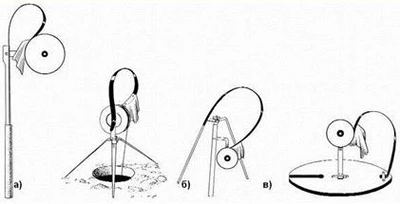 Жерлица для ловли крупных щук не отличается особой утонченностью и во многом оправданно грубовата (по сравнению с жерлицей для ловли судака). Основные типы жерлиц показаны на рис. 1. Тем не менее, при выборе конструкции жерлицы рекомендую придерживаться определенных правил. Необходимо проследить, чтобы у катушки не было осевого люфта. Надевать на штырь ее следует только с помощью втулки, которую лучше изготовить из фторопласта – материала, наименее подверженного примерзанию к металлическому сердечнику при попадании влаги. Сигнализатор поклевки (или фиксатор) должен срабатывать при усилии, соответствующем не более 0,15 кг. Катушку устанавливают таким образом, чтобы она отступала от плоскости кронштейна-держателя не более чем на 1–1,5 мм и от поверхности льда не менее чем на 10 см. Диаметр катушки должен быть не менее 40–50 мм, а борта – выступать над рабочей поверхностью на 12–15 мм, чтобы предотвратить самопроизвольное сбрасывание и перехлестывание лески во время хватки хищника и раскручивания катушки. Рис. 1. Основные конструкции жерлиц: а) на одиночной стойке; б) «треножник» (даны два варианта фиксации катушки); в) на несущем основании. При раскручивании катушка должна обладать определенной инерцией торможения, чтобы не допускать лишнего сброса лески. Для ловли щук жерлицами в водоемах, в которых кислородный режим остается приемлемым на протяжении всего периода ловли со льда, лучше всего подходит поводок в мягкой оплетке со стальным сердечником или смонтированный из поводкового материала типа «кевлар». Если жерлица не оставляется на ночь вместо стального поводка вполне подходит поводок из «плетенки» диаметром 0,3 мм. Возможно, что в скором времени появятся поводки из более совершенных материалов. В водоемах, близких к заморным, поводки с металлическим сердечником ставятся на жерлицы только в начале становления льда. В дальнейшем устанавливаются двойные поводки, а ближе к середине зимы – одинарные и только из «плетенки» или монолески. Идеальным считается поводок, длина которого не менее 250–400 мм. Стойка или основание жерлицы должны быть изготовлены из материала, не очень подверженного примерзанию ко льду. Обычно, это дерево или пластик. Каждый рыболов пользуется жерлицами, отвечающими только его вкусу. Если они изготовлены с соблюдением данных требований и не имеют конструктивных недоработок, то разного рода нюансы погоды не делают. Главное – чем проще, компактнее – тем лучше. Тактика ловли щукиНаиболее крупные гряды, свалы, изгибы русла, слияния рек и середина водоема чаще всего заняты судачьей стаей. Во всех случаях, где судака много, именно эта рыба является хозяином водной стихии. Если некоторые глубинные щуки, выдерживая натиск конкурента, не уходят с судачьих бровок, то все равно кормятся урывками, когда судаки временно перемещаются в другое место. Вывод один: русло водоема, ямы с сильным течением – места обитания судака. Щука же любит неглубокие заливы, ямы с выходом на мель, коряжники, прилегающие к руслу, но не к его фарватеру. Если течение сильное, то всегда надо искать тихую гавань за естественным или искусственным укрытием: выступающим мысом, поворотом русла, островом, местом, где образуется обратное течение, и т.д. Впадающие в водоем ручьи – тоже излюбленные места обитания щук. Где ставить жерлицы?Часть жерлиц н
