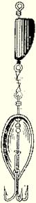 Рис. 2. Блесна, соединенная с грузом без поводка За последние годы большое распространение получила ловля спиннингом на мертвую рыбку, или, как ее называют снасточку. Насадкой обычной служат мелкая плотва, уклея, пескарь, красноперка. Имеет ли снасточка преимущества перед блесной? На этот счет существуют различные мнения: одни рыболовы удачнее ловят на снасточку, другие — на блесну. Если судить по результатам ловли большого числа рыболовов, то получается, что при ловле щук снасточка имеет некоторые преимущества перед блесной. Но вывод этот нельзя распространять на другие виды хищных рыб. Например, судака и окуня лучше ловить на блесну, чем на снасточку. Итак, решение вопроса о преимуществе блесны или снасточки зависит от того, какую хищную рыбу предполагается ловить и каков характер водоема. Однако чтобы сделать обоснованные выводы, этот вопрос еще следует изучать. От чего зависит успех ловли спиннингом? Здесь следует прежде всего иметь в виду следующее. Некоторые молодые рыболовы, спиннингом, стараются как можно больше делать забросов. Но стоит ли себя изнурять этим? Думается, что не стоит. Можно быть рекордсменом по забросам, но если не научишься вести блесну после заброса, делать паузы на глубине, обнаруживать щучьи места — успеха не достигнешь. Нужно хорошенько усвоить игру блесны, заставить хищника обратить на нее внимание. Некоторые спиннингисты предпочитают вести блесну скачкообразно, уступами, с частой и резкой переменой скорости. Однако такой прием не всегда оправдывает себя. Не дает успеха и прямолинейное ведение приманки вполводы при ускоренной подмотке лесы. На успешность ловли хищной рыбы, безусловно, оказывает влияние освещение водоема солнечными лучами. Опытным спиннингистам хорошо известно, что щука, судак и окунь редко бросаются за блесной, когда яркий солнечный свет ослепляет им глаза. Это необходимо иметь в виду при ловле на мелководных местах. Поэтому рыболов должен забрасывать снасть так, чтобы солнце при забросах светило ему в лицо. Практика показывает, что поклевка на снасточку передается более легким толчком, чем на блесну. Иногда толчок почти не ощущается, и о том, что рыба взяла, бывает видно по отклонению лесы в ту или иную сторону. При поклевке на снасточку следует ослаблять лесу, обождать 2–3 секунды и только после этого подсекать рыбу. Ловля щуки на ходовую донкуЭтот способ ужения щук (судаков, окуней) давно известен; он описан еще Л. П. Сабанеевым как ловля плавом. Несмотря на большую эмоциональность и результативность, ужение ходовой донкой у нас мало распространено. Думаю, основная причина такого положения состоит в том, что многие рыболовы не знакомы с этой ловлей. Для ужения ходовой донкой применяется одноручный спиннинг; удилище не должно быть жестким. Катушка удобнее инерционная, со слабым тормозом. Если охота идет на щук (судаков), берут лесу диаметром 0,4 мм. К концу ее привязывают грузик массой 50 г и более — в зависимости от силы ветра и течения. В 25–30 см выше грузика к лесе крепят карабин на тонкой сталистой проволоке, удлиненной формы, размером 3–4 см. Он предотвращает запутывание живца с лесой. К свободному концу карабина привязывают поводок из мягкой тонкой проволоки; длина его 12–15 см. Крючок — тройник № 7–9. На щук применяют мелкого живца — пескаря, плотвичку, карасика и других, в зави