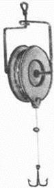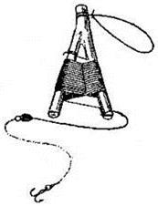 Рис. 1. Классическая жерлица-рогулька Оба длинные конца слегка расщепляются ножом (разрезы должны идти в плоскости жерлицы, а не поперек ее), а на толстом конце вырезается желобок для крепления рогульки к шесту. Я для большей надежности желобок не вырезаю, но просверливаю в толстом конце отверстие диаметром 3–4 мм — и, несколько раз пропустив в это отверстие свободный конец рабочего шнура жерлицы, делаю на нем петлю для крепления в колу. У жерлицы с таким усовершенствованием на две точки крепления меньше — от рогульки не сможет отвязаться ни рабочий шнур, ни крепежный. Затем жерлица оснащается леской или тонким капроновым шнуром. Последний, на мой взгляд, удобнее. Дело в том, что во время активного щучьего жора некогда аккуратно укладывать леску как положено, «восьмеркой» — приходится быстро намотать ее вокруг рогульки, насадить нового живца и плыть к другим размотавшимся жерлицам. Леска при таком нештатном способе намотки часто соскальзывает с жерлицы, с узкого ее конца. Со шнуром же таких казусов не случается. Есть у шнура и недостатки — если жерлица по условиям ловли находится в воде, а не над водою, шнур более мононити подвержен действию водных микроорганизмов (особенно в непроточной воде), и за 1–2 сезона приходит в негодность. Длина лески или шнура зависит от предполагаемой глубины на месте ловли. Когда живец насажен и опущен на нужную глубину, на жерлице должен оставаться запас шнура 6–7 метров. К концу лески привязывают груз, обычно не превышающий 10–12 граммов и зависящий от величины и бойкости живца. Дальше (обязательно через карабин с застежкой) крепится металлический поводок. Раньше я использовал любые поводки, подвернувшиеся под руку, но у крученых стальных, продававшихся в рыболовных магазинах, выявился крупный недостаток: при постоянной ловле, когда жерлица неделями стоит в воде, между волокнами металла возникает незаметная коррозия — и очередная щука обрывает поводок. Теперь я пользуюсь для изготовления поводков исключительно нихромовой проволокой диаметром 0,3 мм, и служат они практически вечно. Если на жерлицу намотан шнур, то полезно поставить между ним и грузилом подлесок из монолески, метра полтора длиной. Последний элемент оснастки — крючок. Но о жерличных крючках поговорим чуть позже, ибо зависят они от способов насаживания живца, коих придумано рыболовами великое множество. Жерлицу-рогульку формы можно не только вырезать из раздвоенного сучка. Можно выпилить из доски или толстой многослойной фанеры — но тогда придется закруглять «рожки», пропитывать заготовку олифой, красить… довольно хлопотное занятие. Можно согнуть буквой «П» отрезок толстого металлического прутка… Жерлицы-рогульки фабричного производства штампуют из пластмассы. Кроме классических рогулек, рыболовами придумано еще немало конструкций жерлиц, более или менее остроумных, но все они не имеют главного достоинства — простоты изготовления. Сам я кроме рогулек изготавливаю для летней ловли лишь жерлицы еще одного вида: из опустевших бобин из-под лески и куска любой подходящей по диаметру проволоки (не стоит лишь использовать ломкий алюминий).