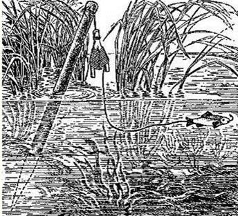 Рис. 2. Жерлица из бобины из-под лески Конструкцию, думаю, описывать не надо, она совершенно ясна из рис. 2. Пожалуй, сделать такую жерлицу даже проще и быстрее, чем рогульку, но подходящих сучков можно нарезать в леску сколько угодно, а бобины освобождаются от лески не так уж часто. Ловля жерлицамиНа рисунке 3, позаимствованном из классического труда Сабанеева, изображена выставленная и насаженная жерлица. Готовая, так сказать, к бою. Не буду обвинять классика в том, что он слабо разбирался в теме, но уж за художником Леонид Павлович не проследил, совершенно точно. Дело в том, что нарисовано все вроде правильно: кол воткнут в донный грунт, к нему привязана жерлица, живец плавает бойко, не кверху брюхом… Вот только щука едва ли попалась бы на изображенную снасть. Однако картинка все же полезная — ошибки начинающих жерличников видны на ней наглядно.