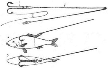 Рис. 5. Жерличная шлейка конструкции И. Михайлова: 1 — двойник; 2 — двухколенный поводок; тонкая гибкая проволока для шлейки; 4 и 5 — впряженная рыбка Некоторые рыболовы советуют при помощи толстой иглы проводить поводок сквозь спину живца у основания спинного плавника, а затем уже продевать под жаберную крышку и надевать двойной крючок. Определенный резон в таком способе есть — щука при хватке не сдвинет живца по поводку. Но возиться с иглой на водоеме — лодка качается на волнах, живец бьется в руках и норовит выскользнуть — не очень удобно. Более рационально ввести в оснастку еще один крючок, одинарный. Припаять его или примотать самой тонкой проволокой в нескольких сантиметрах от конца поводка, — так, чтобы жало было направлено к хвосту живца. И прокалывать этим крючком спину живца, неглубоко, чтобы не зацепить хребет. Другие специалисты проводят поводок насквозь, через анальное отверстие выводя его в рот живца. По их словам, если сделать это аккуратно, не повредив внутренние органы, живец будет жить несколько часов, и щука не имеет ни малейшего шанса сорвать его. Мои опыты подобного насаживания закончились неудачно — рыбки относительно быстро погибали. Используются жерлицы не только для ловли щук в сезон открытой воды, но и зимой, при подледной ловле. Однако конструктивно зимние жерлицы довольно сильно отличаются (хотя можно с успехом использовать зимой и летние). К тому же образ жизни щуки подо льдом меняется достаточно сильно, что влияет на тактику ловли. Поэтому зимние жерлицы заслуживают отдельного разговора, а мы пока рассмотрим другую разновидность жерлиц — плавучие жерлицы, самые известные и широко употребляемые из которых называются кружками. (А. Шаганов) | |