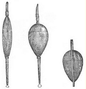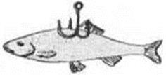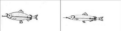 Рис. 1. Щучьи поплавки; слева — разрезной поплавок Иногда приходится ловить, опуская живца всего на 30–40 см (например, в тех местах, где главным объектом щучьей охоты служат держащиеся у поверхности уклейки). Тогда случается, что разрезной поплавок, особенно если он ярко раскрашен, настораживает относительно сытую хищницу (голодная щука, бросаясь на живца, ни на что не обращает внимания). Если рыболов при ловле поверху видит рядом с поплавком бурун, а хватка не следует, и такое повторяется несколько раз, можно попробовать использовать прозрачный поплавок-шар, если его нет под рукой — соорудить импровизированный поплавок из подходящего по размеру сучка. Способы насаживания живца зависят от характера клева. В мае, через неделю-полторы после нереста, хищницы голодны и довольно бессистемно бродят по водоему — мест, подходящих для постоянных щучьих засад, еще не так много, водная растительность не поднялась. Хватки следуют одна за одной, и нередко в желудке у пойманной щуки можно обнаружить собственного живца, незадолго до того сорванного с крючка. Поэтому насаживать живцов можно простейшим (и самым быстрым) способом, зацепляя за спинку одним поддевом тройника. Подсечка должна следовать незамедлительно, сразу после исчезновения поплавка, выжидать нечего — тройник либо угодил в пасть щуке, либо нет. Пустые подсечки случаются часто, но жалеть о них некогда — буквально на следующем забросе следует новая хватка. К тому же в основном виновники «осечек» — небольшие щучки.