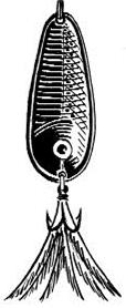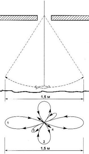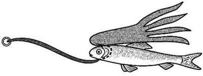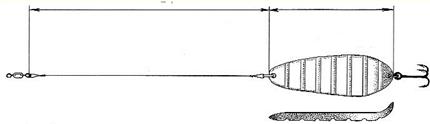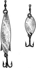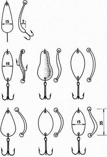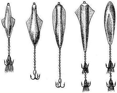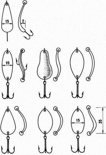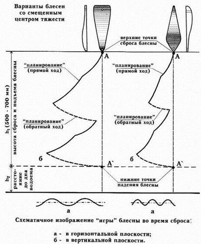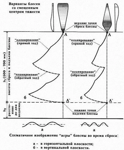 Рис. 3. Спиннинговые блесны, успешно применяемые при ловле со льда: а) «Tobi» фирмы Abu Garсia; б) «Crocodile» фирмы BETE Эти блесны оказались намного эффективней большинства применяемых классических зимних приманок. Кстати, что такое щучья приманка и как она выглядит, знают немногие. Иногда рыболов слишком многого хочет от куска произвольно выгнутой железяки, которую гордо называет «зимней блесной». Очевидно, проще поймать щуку руками, чем дождаться поклевки на большинство зимних блесен. Среди множества блесен для ловли щуки в отвес со льда хотелось бы выделить финские блесны «Professor» и «Rasanen» фирмы Kuusamo. Большинство блесен этой серии органически вписываются в любые завихрения водных потоков как на сильном течении, так и в стоячей воде. Они выделяются естественной игрой во время свободного падения, очень напоминающей движение убегающей от хищника рыбки. Блесна «Профессор» послужила прототипом для создания десятков схожих по конструкции приманок. «Профессор» по сей день остается самой любимой блесной у финских рыболовов, а уж финны толк в отвесной рыбалке со льда знают. Блесны со смещенным центром тяжести (с обратным ходом)При ловле в определенные отрезки времени в глухозимье (январь-февраль) щуку и судака можно заинтересовать только блеснами со смещенным центром тяжести или блеснами, обладающими обратным ходом. Как видно из рисунка блесна, казалось бы, должна остановить свое движение и замереть на месте раза 3–4 , но вместо этого приближаясь к вертикальной оси, она раз за разом уходит в сторону. Подобные блесны имеют сложную геометрию профиля (разную толщину по длине блесны, в отдельных случаях асимметричность боковых сторон по отношению к вертикальной оси). И никакого беспорядочного метания здесь нет – блесна идет по строго заданному контуру влево – вправо, вправо – влево, не меняя амплитуды. За один сброс блесна совершает несколько «уходов» в сторону (рис. 4). Рис. 4. Блесна со смещенным центром тяжести для ловли на глубинах до 3,5 м и их перемещение после сброса Щуку интересует неторопливое «возвращение» приманки к вертикальной оси, а когда оно повторяется несколько раз – хищник не выдерживает. И что самое интересное, когда хищник берет на такие блесны, он практически не замечает игру других приманок. Ни в коем случае не следует считать, что каждая из блесен со смещенным центром тяжести является неотразимой для хищника. Уловистых блесен такого типа единицы и рыболовы ими очень дорожат. Подобные блесны наиболее точно имитируют импульсы и движение убегающей от хищника подраненной рыбки, с которой последнему справиться не составляет труда. Скандинавские блесныМногочисленные варианты скандинавских блесен с подвесной цепочкой, мягким тросиком (реже леской), оснащенные одинарным, двойным или тройным крючком малых размеров для ловли крупной щуки малопригодны. Зубастая, даже в период минимальной активности, хватает блесну поперек, не обращая внимания на болтающуюся фитюльку в виде цепочки и крючка, поэтому надежно подсечь экземпляр крупнее 1,5 кг практически невозможно. Обычно, несмотря на все усилия рыболова, крючок цепляет хищницу с внешней стороны головы в районе жабр – сход практически неминуем. При насадке на крючок мелкой рыбешки на блесны ловятся щурята до 0,5 кг (рис. 5). Рис. 5. Скандинавские планирующие блесны Приемы ловли щуки на