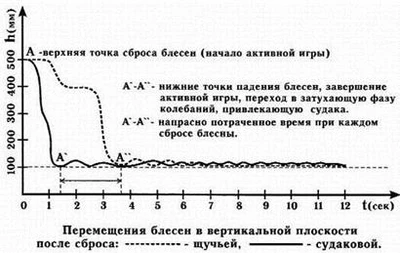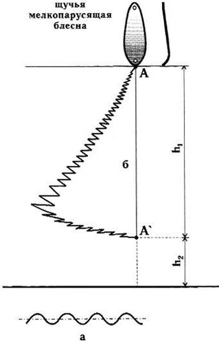 Щучья блесна, в отличие от судачьей, должна хорошо планировать. Она, как правило, больше, легче и шире. Если судака, в большинстве случаев, привлекают последние затухающие колебания приманки, в какой-то степени даже ее полная остановка, то щуку чаще всего провоцирует на хватку движение или игра приманки. Как правило, щучья блесна при сбросе сразу уходит в сторону, почти горизонтально (в начале зимы этот угол близок к 65–70°, в глухозимье – к 45–50°). Несмотря на активные замысловатые движения, уловистая блесна всегда имеет свой четкий рисунок игры. Сказать, что щука берет только на однотипные приманки, обладающие конкретной заданной игрой, нельзя. В разное время ее интересуют разные блесны, то же можно сказать и об игре. За одну рыбалку рыболову приходится поменять десяток блесен, чтобы убедиться в том, что в момент ловли щука реагирует только на конкретную приманку. Допустим, на блесну, которая, постоянно уходя в сторону, мелко парусит, как бы трепещет, или плавно перемещается, рыскает в горизонтальной плоскости (рис. 1). Если в игре блесны сочетаются подобные свойства – ее вполне можно назвать щучьей. Рис. 1. Планирующая мелко парусящая блесна По первому льду пятнистая в большей степени соблазняется планирующими блеснами, которые с первого момента свободного падения развивают приличную «стартовую» скорость, быстро выбирая отпущенный им запас лески. Начальные рывки и ускорения отчетливо передаются рыболову по леске, кивку и вершинке удилища. Подобные блесны по праву можно считать универсальными, так как они прекрасно проявляют себя как при ловле спиннингом в замкнутых водоемах и на слабом течении, так и со льда. С момента сброса до полного затухания колебаний проходит, как правило, от 5 секунд (в середине зимы) до 15 секунд (в период глухозимья). Щука обращает внимание на несъедобную приманку при переходе с верхнего уровня игры (максимальное отклонение блесны от вертикальной оси при сбросе 45–65°) на нижний уровень (отклонение от вертикальной оси 25–35°). В этот момент чаще всего следует хватка хищника. Если блесна быстрее, чем за 2 секунды после сброса, доходит до нижней точки (судаковый вариант приманки для ловли на глубине), щука ею не заинтересуется. Это один из самых удобных критериев отбора щучьих блесен (рис. 2). Рис. 2. График перемещения щучьей и судаковой блесен при сбросе Если условно взять верхние и нижние точки игры блесны (от начала сброса до падения), хватка следует в нижней трети. Многие уловистые блесны при падении переваливаются с боку на бок, курсируют вверх-вниз, рыскают в горизонтальной плоскости, но никогда не кувыркаются при уходах в сторону, не входят в штопор и, тем более, не падают камнем вниз. Габариты блесны, естественно, если они не выходят за пределы здравого смысла, не отпугивают хищника. Главное – это игра приманки. Поэтому не надо бояться применять зимой летние блесны, хорошая, уловистая приманка всегда обладает универсальностью, то есть предназначена для ловли в любое время года. Для ловли щуки со льда в середине зимы хорошо зарекомендовали себя блесны Ciclops фирмы Mepps, Hopkins, Tobi фирмы Abu Garcia, Masau и Silver Creek фирмы Daiwa, Lure Jensen (рис. 3). а)