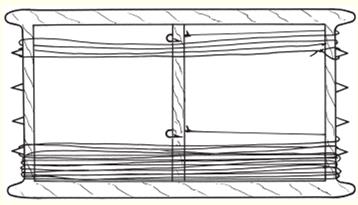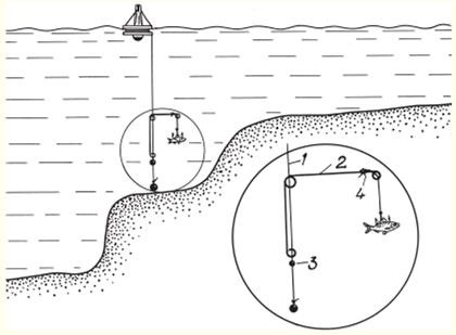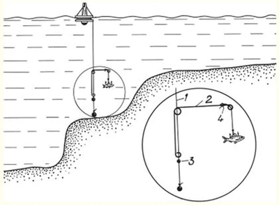Рис. 2. Мотовильце для запасных поводков В периоды, когда судак охотится у дна или в толще воды, также хорошо подходят в качестве наживки ерш, пескарь, плотвичка и некоторые рыбы других видов. Живец должен ходить на поводке бойко, тогда он быстро привлечет к себе судака. На водоемах с большим разгоном волны при ловле на обычные кружки нередко происходят холостые перевертки. Чтобы кружок сильно не бросало волной, нужно, чтобы плоскость его была большой, а штырь утяжелен у основания. Для этого штырь делается полым, а сам кружок берется диаметром 20 см. В полость штыря засыпается дробь или картечь, которая при перевертке снова уходит вниз, придавая кружку устойчивость. При ловле в ночное время пользуются, как правило, кружками обычной конструкции (так как летней ночью ветер редко дует). Но чтобы кружок был хорошо виден, на оба конца штыря наносят фосфоресцирующую краску или крепят специальную наклейку, которая светится в темноте. Время клева судакаСчитается, что пик летней кормовой активности судака – это полчаса после захода и час до восхода солнца. Но в период охоты на уклейку судак может ловиться с переменным успехом и в течение всего дня. В конце лета и осенью судак иногда выходит на охоту в середине дня, но она обычно бывает непродолжительной. При этом в районе бровок (и не только) судак может периодами охотиться то возле самого дна (тогда живца устанавливают в 50–70 см от дна), то в толще воды. Кроме того, судак бывает активен ночью. На ночь лучше ставить заякоренные кружки, размещая их в районе бровок. Оснастка заякоренного кружка показана на рис. 3. Перед тем как «зарядить» такой кружок, необходимо выставить фиксатор поводка на соответствующий уровень ловли (обычно 40–60 см), затем надежно нацепить живца за верхнее нёбо и опустить грузило на дно. Смотав свободную часть лески, необходимо ее вставить в прорезь так, чтобы основная леска под тяжестью груза оставалась в натянутом положении. При поклевке диск переворачивается, и сверху оказывается нижняя (белая) сторона; рыба тянет за поводок, и он, беспрепятственно скользя по основной леске, заставляет кружок разматываться. Обычно для заякоренного кружка используется концевой груз весом 200–300 г. Рис. 3. Заякоренный кружок для ночной ловли судака на бровке: 1 – основная леска; 2 – проволочка со скользящими кольцами, изогнутая под углом 90 градусов; 3 – стопорящая дробинка; 4 – место для привязывания поводковой лески на монтажной проволочке Ночная активность судака часто совпадает с периодом активности леща, стаи которого «клыкастый» нередко сопровождает. Кстати, в начале лета можно приблизительно определить район охоты судака по лещу, который на утренних зорях нередко плещется у поверхности воды. Поклевка и вываживание судакаКогда судак активный, обычно кружок резко переворачивается. Но бывает, что кружок наклоняется и только потом переворачивается. Если сразу подплыть к кружку и сделать подсечку, то живца можно вырвать изо рта судака. Нужно дождаться, чтобы после перевертки кружка леска начала разматываться. И только после того, как смотаются 1,5–3 м лески, можно сделать подсечку. Она должна быть не слишком резкая, но достаточно энергичная. В Подмосковье есть немало водохранилищ, в которых судак выходит на охоту в районе коряжника. Часто корягами усеяно дно заливов, в которые впадают прит