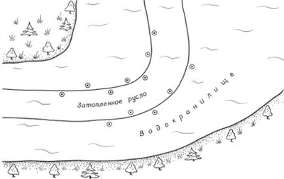 Ловля судака на кружки летомЛовля судака на кружки обычно приносит более весомые результаты, чем ловля спиннингом, однако требует довольно кропотливой работы. Если судак активный, он берет проплывающего мимо него живца без промедления. Период наиболее активного клева судака наступает спустя 10–15 дней после нереста, а нерестится судак в водоемах средней полосы России обычно в конце мая (преимущественно при температуре воды 18–20 °C). В это время в водохранилищах ближе к устьям притоков бывают массовые выходы уклейки (эта рыба нерестится в несколько этапов с мая по июль). Изголодавшийся за время нереста судак в местах скопления уклейки устраивает на нее массовые охоты. На Яузском водохранилище и ряде других водохранилищ встречаются места, где судак в июне ловится в большом количестве. Важно выбрать правильную тактику ловли и иметь в кане живую уклейку, – эта рыбка долго остается живой, когда в кан идет подкачка кислорода. Чтобы наловить с запасом уклейки, рыболовы используют мелкоячеечные «телевизоры» и специальные сетки. В некоторых притоках уклейку можно наловить подъемником. За неимением специальных снастей уклейку ловят удочкой, хотя это процесс довольно долгий. Тактика ловли судакаВо время своих охот судак перемещается за стаями мелкой рыбы. Уклейка в начале лета ходит поверху, а это значит, что вблизи поверхности воды нужно ловить и судака. Уровень установки живца – 1–1,5 м от поверхности. Однако не всегда можно определить, где концентрируется уклейка, поэтому в ходе ловле на кружки ориентируются по подводному рельефу. Обычно судак всегда держится в районе свалов, где глубина с 4–6 м может резко понижаться до 8-10 м. Поэтому выстроенные в ряд или в определенном порядке кружки пускают по поливу перпендикулярно затопленному руслу. В безветренную погоду кружки можно расставить по краю русла или по краю обширной ямы (рис. 1). Если нет поклевок поверху, можно сделать отпуск живой приманки в толщу воды или даже расположить ее вблизи дна. При этом нужно следить, чтобы при прогоне кружка живец не цеплял дно. Рис. 1. Установка кружков в безветренную погоду В середине лета, когда цветет вода, судак практически не питается; активно кормиться он начинает в августе. В это время его чаще всего ловят на утренних и вечерних зорях в районе различных бровок. При этом наблюдается закономерность: утром судак обычно берет ближе к поверхности или в толще воды, а вечером – со дна. Рассчитывая на ночную ловлю судака, необходимо учитывать, что при яркой луне этот хищник клюет плохо. Часто пускают кружки наугад, все время перемещаясь вдоль русла, так как не всегда можно легко определить, в каком именно месте на бровке стоит судак. Поклевки могут возникать и на поливе в достаточном удалении от русла. Делая прогон кружков, нужно отмечать место начала поклевок специальными пенопластовыми буйками. Иногда с этой целью можно использовать небольшие пластиковые бутылки. В случае если судак клюет исключительно на бровке, прогон кружков делают коротким, чтобы не терять время. Но все равно кружкам нужно дать отплыть на достаточное расстояние, чтобы не «подшуметь» рыбу. Оснастка кружкаОсновная леска берется диаметром 0,28-0,35 мм. Ее запас должен составлять 12–15 м, ведь ловить судака даже в начале лета приходится не только у поверхности или в толще воды, но иногда и 