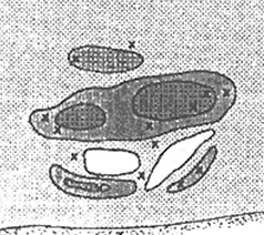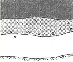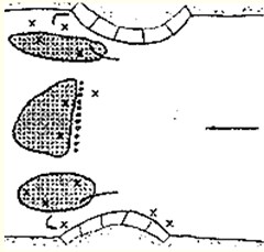 з) Каменистая россыпь. Река, встречая на своем пути скальную породу, постепенно размывает ее, и некогда монолитная глыба превращается в вытянутую по течению россыпь больших или меньших камней. Хотя ловля на камнях и чревата многочисленными зацепами, не надо обходить такие места стороной, особенно летом, когда поймать судака где-то еще становится проблематичным, Каменистых россыпей много на Верхней Волге, есть они и на Оке — в районе Поленова и выше.