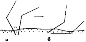 Рис. 3. Поперечная (а) и продольная (б) позиции удилища при проводке под углом При штиле и слабом ветре вершинку удилища лучше держать высоко — на уровне головы. Тогда более длинный участок лески находится над водой, леска не искривляется течением, и проводка и поклевка чувствуются лучше. Иногда положение кончика удилища определяется фоном, на котором вы его видите. Бывает, что его лучше опустить, чтобы выходящая из тюльпана леска была видна на фоне темной воды, или, напротив, поднять повыше — так, чтобы вы видели леску на фоне светлого неба. Поскольку световая тональность неба, воды и берега сильно зависит от освещенности, положения солнца, волнения и т. п., всякий раз нужно выбирать ту высоту удилища, на которой вам не приходится излишне напрягаться при слежении за проводкой. Сильный ветер — враг номер один нормальной проводки. Если при слабом ветре чувствовать проводку в состоянии практически любой начинающий спиннингист, которому мало-мальски понятно, как это делается, то в ветреную погоду, когда водоем сплошь покрыт пенными «барашками», даже у матерых судачатников опускаются в отчаянии руки. В стоячей воде сильный ветер при недалеком забросе не создает непреодолимых проблем, хотя и там едва ли кто-то бывает от него в восторге. На реках же ветер способен начисто «сдуть» с берегов всех спиннингистов. Я долго не мог приспособиться к ловле судака в сильный (более 10 м/с) ветер, и, если он поднимался, переключался на охоту на жереха или другую рыбу способом, не требующим идеального чувства проводки. Но в последнее время приноровился ловить судака в любой ветер. Самое простое — правильно выбрать место. Обычно я имею возможность выбора из четырех-пяти мест на разных берегах и участках реки, где ловится судак. Узнав накануне вечером прогноз направления ветра (а он сбывается с вероятностью более 80 %), я отправляюсь на тот участок, где ветер будет дуть в спину. Но даже если этого сделать не удалось, и вы оказались на том участке берега, где сильный ветер имеет иное направление, отнюдь не все потеряно. Из всех неблагоприятных направлений ветра наименее неблагоприятное, когда он дует строго в лоб. Такой ветер заметно уменьшает дальность заброса, но лишь немного притупляет чувство проводки — он как бы придавливает леску к воде. Поэтому если ветер имеет встречное или близкое к нему направление, следует забрасывать так, чтобы тот участок проводки, где, на ваш взгляд, наиболее возможны поклевки судака, приманка проходила в то время, когда леска направлена против ветра. Это позволяет свести к минимуму слепые поклевки — их не намного больше, чем бывает при ловле в слабый ветер. Хуже всего, если дует боковой или встречно-боковой ветер. Рельеф речной долины создает такие условия, при которых ветер, имеющий направление, отличающееся градусов на 20–30 от направления реки, разворачивается и дует, как по трубе, вдоль долины. При этом леска образует такую крутую дугу, что приходится мириться с тем, что очень редкая поклевка воспринимается рукой и глазами. Здесь весь расчет на поклевки с самозасечкой, когда судак «виснет». Таких поклевок — об этом чуть позже поговорим подробнее — бывает достаточно много. Не чувствуя поклевку, при сильном боковом ветре можно и нужно чувствовать проводку. Приходится, конечно, напрягаться, но ничего не поделаешь — по другому е
