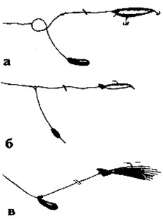 Рис. 4. Варианты оснастки для донной проводки: а) патерностер; б) баунсер; в) тиретт Я хотел бы порекомендовать главным образом оснастку «Тиретт» — со скользящим грузиком и плавающей джиг-головкой (рис. 4в). Она хороша тем, что позволяет сочетать элементы донной и ступенчатой проводки и мало подвержена зацепам. Цикл проводки состоит из подтягивания приманки — 3–5 оборотов катушки в замедленном темпе, остановки и небольшой (полметра) отдачи лески за счет обратного движения кончика удилища. Во время подмотки грузило волочится по дну, приманка следует за ним чуть выше. При отдаче лески приманка всплывает. Большая часть судачьих поклевок у меня случалась как раз в этой фазе проводки. Поклевка на всплытии по понятным причинам бывает очень слабой и невыразительной — ее вообще можно заметить только потому, что на «Тиретт» ловят только в тихой воде и, как правило, с недальним забросом. Впрочем, о поклевке судака при любом другом способе его ловли едва ли можно сказать что-то существенно иное. В отличие от жереха, голавля или лососевых, судак берет приманку без сильного и отчетливого рывка, поэтому многие судачьи поклевки проходят незамеченными, особенно в неблагоприятных для этого условиях. Вообще, поклевка судака (точнее — то, как мы ее воспринимаем) зависит от способа ведения приманки, длины и кривизны лески, глубины, течения и ветра, времени года, направления атаки, типа лески, удилища и катушки, от особенностей, свойственных судаку на конкретном участке водоема. То есть факторов, влияющих на восприятие поклевки, очень и очень много, и говорить о том, что судачья поклевка ощущается всякий раз одинаково, не приходится. Я позволю себе максимально подробно остановиться на описании поклевки судака, поскольку это один из наиболее ответственных моментов в его ловле спиннингом, от которого напрямую зависит и количество выловленных «хвостов», и полученное от процесса эстетическое удовольствие. Начнем с поклевки, самой характерной для судака — поклевки во время паузы при ступенчатой проводке поролоновой рыбки, твистера, мертвой рыбки на снасточке и т. п. В идеальных условиях — при отсутствии ветра, несильном течении, оптимальной глубине и активном судаке — поклевка воспринимается следующим образом. Вы останавливаете подмотку, приманка погружается (а на течении еще и дрейфует), и вдруг следует более или менее отчетливый толчок, который ощущается рукой, виден по вздрагиванию кончика спиннинга и по небольшому, но резкому изменению провисания лески. Такая поклевка отличается от задевов за дно: когда приманка касается донных выступов, леска натягивается относительно плавно. Насколько сильной будет поклевка, почти не зависит от размеров судака. И двухсотграммовый «карандаш», и судак весом три-четыре килограмма «бьют» примерно одинаково — о размере рыбы узнаешь только после подсечки, если она, конечно, удачная. После пустой поклевки о величине судака можно судить по полоскам от клыков на свинцовом грузике — чем они глубже и шире, тем крупнее судак. В редких случаях крупный судак берет не толчком, а коротким, но мощным рывком. Руки во время проводки расслаблены, и когда следует такой рывок, спиннинг дергается вперед. Это хорошо заметно со стороны, и если за вами в этот момент кто-то наблюдал, можете не говорить, что у вас была мощная поклевка — о