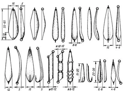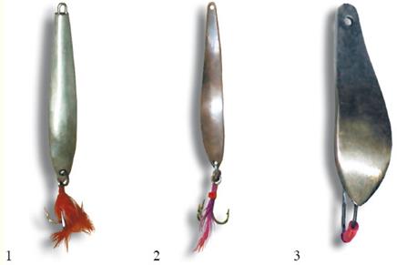 Рис. 2. Тяжелая блесна для ловли судака на больших глубинах и при сильном течении Массу блесны, как, впрочем, и других приманок, подбирают в зависимости от глубины в месте ловли и силы течения. При ловле в водохранилищах я пользуюсь приманками весом от 8 до 20 г. На реках, таких как Ока, Волга, где довольно сильное течение, вес приманки следует увеличивать до 40–50 г, иногда и до 60 г (рис. 2). На Нижней Волге, например, с более легкой приманкой вы попросту не будете чувствовать дно. Исключение – спокойные плесы и заливы. В водоемах без течения игра приманкой должна быть более замедленной и деликатной, нежели в тех, где есть течение. Довольно часто бывает, когда судак стучит по приманке, но не подсекается. Если вы ловите на блесну, попробуйте предложить несговорчивому хищнику балансир или твистер. Неплохо иногда срабатывает также подсадка на крючок блесны или другой приманки маленькой полоски кожи белой рыбешки или ее потрошков. При ловле судака основные требования к подсечке и вываживанию следующие. Крючки должны быть надежными, желательно с трехгранным жалом. Они легче пробивают костистую пасть этого хищника. Всякий раз, подводя клыкастого к нижней поверхности льда, необходимо учитывать, что судак как донный глубоководный хищник и в зимнее время панически воспринимает «восхождение» к нижней кромке льда. Поэтому я стараюсь бороться с этим хищником так, чтобы он вначале находился в нижних слоях воды, тем более если речь идет о подсеченном крупном экземпляре. Металлический поводок для судака не обязателен, однако подсечка нужна резкая. И еще. Если температура воздуха положительная, судака лучше ловить на плетенку, которая имеет минимальную или нулевую растяжимость. Подсечка в результате получается более надежной. К сожалению, в морозную погоду плетеная леска обмерзает и быстрее разлохмачивается. Зимние жерлицы на судакаВ зимний период бывают дни, когда клыкастого хищника предпочтительнее ловить на живца. И тут зимние жерлицы вне конкуренции. …Солнце уже поднялось довольно высоко, когда мы наконец сбросили с плеч рюкзаки. Мой приятель Иваныч в марте прошлого года ловил в этих местах и уверял меня, что точно вывел на коряжник, в котором поджидают наших живцов волжские щуки. Но, просверлив несколько лунок и замерив глубину в них, он остался чем-то недоволен. Покрутился еще немного, видимо, вспоминая ориентиры, и наконец крикнул: «Тащи рюкзаки. Сверлим здесь!» Пока я устанавливал на глубине около шести метров жерлицы, приятель у берега наловил больше десятка живцов – мелких окуньков. «Других нет, – сказал он, вернувшись с наполненным до половины водой целлофановым пакетом, в котором толкались худосочные рыбешки. И вот все десять жерлиц заряжены, раскинулись веером среди снежной белизны. Теперь остается только ждать. Проходит полчаса, час – поклевок нет. Напарник отводит душу на мелком окуньке. Глянул на часы – уже 11.00. Думаю: «Может, и мне податься на отмель за мелочовкой?» И тут взлетает флажок на крайней жерлице. Без особого труда вынимаю из лунки щучку. В ней примерно 1,5 кг. Начало есть. Подходит приятель, вместе снова заряжаем живцом удачливую жерлицу. Настроение приподнятое. К вечеру, судя по всему, будем с рыбой. Но дальше начинается нечто невообразимое. Почти одновременно взлетают флажки на двух жерлицах. Делаем подсечки. Пусто! На од