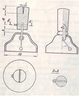 Рис. 3. Оснащение колокольчика деревянной колодочкой с проволочкой для подвешивания на леску