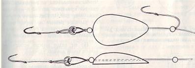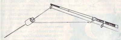 Рис. 4. Способ подвешивания колокольчика с деревянной колодочкой взажим Можно подвешивать колокольчик к леске, слегка зажимая ее в разрез колодочки. Пожалуй, такое крепление — самое удобное. При подсечке леска легко освобождается. Чтобы колокольчик не потерялся, его следует привязать ниткой к палочке-удильнику (рис. 4). Подберите к своим удочкам разные по звуку колокольчики, и вы легко будете ориентироваться, на какой донке клюет. …Как-то весенним днем мне довелось побывать в Ленинграде на стрелке Васильевского острова. На гранитной набережной стояли рыболовы. Каких только донных удочек и приспособлений я там не увидел! Рыболову не всегда приходится забрасывать донку с мягкого берега, в который можно воткнуть палочку, прутик или удильник. На гранитной, каменной набережной или бетонном пирсе в качестве донки нужно что-то другое. На выручку приходит спиннинг. Оснащенный вместо блесны грузилом и двумя-тремя поводками, он может служить поистине универсальной донкой. С любого берега и с лодки спиннингом можно легче и дальше забросить насадку. Им удобнее вываживать рыбу. И сматывается донка быстрее. Придумали дотошные рыболовы к спиннингу и постоянный, неснимаемый сигнализатор поклевок. Использовали для этого белый ролик от электропроводки. Ролик привязывают к удилищу, а леску пропускают через его отверстие (рис. 5). Рис. 5. Ролик-сигнализатор для донки, заброшенной спиннингом С железного пирса на Рыбачьем острове у Балтийска лещей ловят только такими донками. Используют здесь в качестве сигнализатора также шары из пенопласта, подвешиваемые на леску с помощью крючка. Широкое распространение при ловле окуня в заливах получила у нас ходовая донка. Забросив с лодки грузило и два-три поводка с крючками, насаженными выползками, рыболов не спеша делает подмотку — грузило и один крючок волочатся по дну, один-два крючка — у дна. Движущаяся насадка соблазнительна для хищной рыбы. Ходовую донку лучше оснащать конусным грузилом — это предотвратит зацепы в камнях и ракушках. Ездить на Преголю у Тумановки можно с апреля и вплоть до ноября. Но лучшие месяцы для рыбалки здесь май, июль, август. Места столь благословенны для рыболова, что однажды во время отпуска мы решили провести здесь несколько майских дней. Прибыв в этот долгожданный зеленый рай, скидываем тяжеленные рюкзаки, присаживаемся на берегу и долго молча сидим, мечтательно созерцая все вокруг. Теплынь. Тихо. На реке ни морщинки. Вокруг желтоватая, робкая зелень. Слышатся птичьи трели в ближней рощице… Так мы сюда торопились, так не терпелось нам забросить свои донки… и вот идут минуты, а мы сидим, плененные весенней красотой, и до рыбалки нам как будто и дела никакого нет. — Так будем устанавливать контакт с рыбой или как?.. — Надо бы… Сергей начинает хозяйничать на берегу у белого перевального знака, а я немного левее. Потом ставим палатку, собираем сушняк для костра. И все время прислушиваемся, не зазвенит ли колокольчик. У обоих от всего этого состояние блаженства: с каким сожалением приходится обычно рыболову расставаться с вечерней зарей, прерывать неповторимые мгновения, потому что надо успеть на автобус или поезд. А тут — вы подумайте! — так много времени впереди. Солнцу еще долго катиться до горизонта. Но когда оно сядет за лес и даже спрячется совсем, нам не нужно будет поки