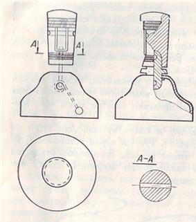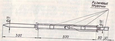 Рис. 2. Скользящее грузило для донной удочки И вот вы пришли на реку, смотали леску на нужную вам длину, присоединили грузило, наживили крючки, воткнули удильник в землю. Размахнулись и плавно послали грузило, чтобы оно как можно тише легло в воду. Затем выбрали конец и закрепили его трубочкой-резинкой. Осталось последнее — прикрепить к леске колокольчик или какой-либо заметный предмет, который будет давать вам сигнал о поклевке. У колокольчика в верхней части имеется язычок с дырочкой, через которую с помощью накидной петли его привязывают к леске. Такое крепление не совсем удобно — длина лески при забросе меняется, значит, каждый раз нужно передвигать и колокольчик, так как он может оказаться слишком далеко или слишком близко от удильника. Чтобы колокольчик после каждого заброса оставался на своем месте и не мешал при подсечке и вываживании рыбы, нужно на его металлический язычок насадить деревянную колодочку, с помощью которой колокольчик можно навешивать на леску или подвешивать к ней (рис. 3). Колодочку обматывают в сильном натяжении капроновой нитью, затем набивают на заостренный напильником язычок, прожигают в ней раскаленной иглой дырочку так, чтобы она совпала с дырочкой язычка. В эту дырочку надо плотно забить деревянный штырек — теперь колодочка будет прикреплена надежно. К верхнему концу колодочки капроновой нитью плотно приматывается изогнутая в виде канцелярской скрепки стальная проволочка, которая и будет удерживать колокольчик на леске.