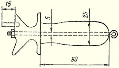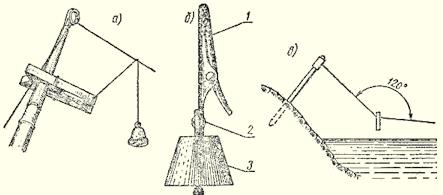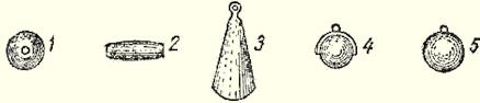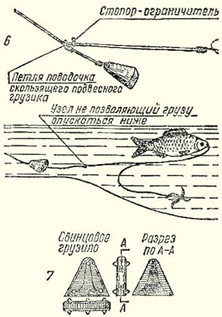 Рис. 1. Приспособление для заброса донных Обычно практикуется ловля не более чем на 3–4 донных. За большим количеством поклевок бывает трудно уследить, многие остаются незамеченными, часто бывают «зевки». Вместо ловли рыболов вынужден заменять объеденную приманку. Для наблюдения за поклевками существует множество конструкций сигнализаторов-подвесок. Характерной их особенностью является закрепление на натянутой после заброса лесе {вблизи кончика удилища). Любой сигнализатор крепится или помещается на лесу временно. После подсечки он обычно соскакивает с лески, освобождая ее для подмотки и вываживания рыбы. В качестве сигнализаторов применяют утяжеленные подвески из пенопласта и пробки, окрашенные в белый цвет. В последнее время все чаще практикуется окраска сигнализаторов светосоставами, хорошо заметными в темноте. На глухой спасти часто применяются звуковые сигнализаторы — всевозможные колокольчики. Они позволяют рыболову при ослаблении клева отойти от снастей, развести костер, попить чаю, сварить уху, а в случае поклевки позовут к снастям. Опытные рыболовы применяют звуковые сигнализаторы разного тона для каждой донной, что позволяет сразу определить, на какой из них клюет (рис. 2). Рис. 2. Крепление сигнализаторов: а — с помощью бельевой прищепки; б — с помощью зажима для бумаг (1 — зажим, 2 — заклепка, 3 — колокольчик); в — угол оттяжки лесы за счет веса сигнализатора Донные оборудуются запасом лески до 40 м диаметром 0,4–0,6 мм, поводки всегда на 0,1–0,2 мм тоньше. Катушечная снасть позволяет применять лесу диаметром 0,3–0,4 мм. Часть лески длиной до 10 м и поводки обязательно окрашиваются в песочный или коричневый цвет. Длина поводков 0,2–0,4 м. Для ловли щуки иногда применяют металлические трехколенные поводки, которые обязательно оксидируют. Крючки, применяемые для донных, должны быть особо остро наточены. Размер их зависит от приманки и величины ожидаемой в уловах рыбы. Белые крючки не применяются. Даже при ловле на малька и живца. Грузила донных — важная часть оснастки. Существует две системы оснащения. Скользящее грузило применяется на дне с твердым грунтом, оно обеспечивает лучшую маскировку снасти, так как приманка находится впереди него и грузило не так отпугивает рыбу. На илистом или захламленном дне проход лески через отверстие скользящего грузила затруднен, что ослабляет сигналы поклевок, а сопротивление настораживает рыбу. В этих случаях применяется концевое, глухое грузило. Оно обычно помещается на отдельном поводке, который на 0,1 мм и более по диаметру тоньше основной лески. Поводок с крючком располагается выше грузила (не доходит на 10–12 см). Если помещается второй поводок, то он на такое же расстояние не должен доходить до первого. Скользящее грузило чаще применяется на реках, а концевое — на озерах и водохранилищах (рис. 3).