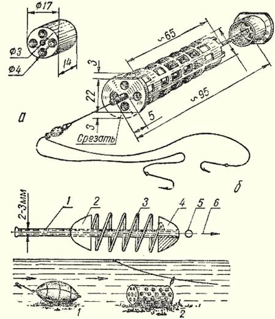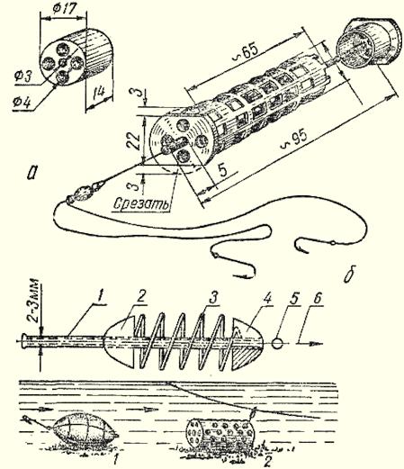 Рис. 3. Конструкции грузил для донного ужения: 1, 2 — скользящие; 3, 4, 5 — глухие; 6 — скользящее подвесное; 7 — для сильного течения Особое место занимают в оснастке грузила-кормушки. Они также могут быть скользящими и концевыми. У скользящего леска проходит через кормушку по трубочке, чтобы набитая в кормушку приманка не тормозила ход лески. У концевого в 25 см выше кормушки ставят на леску короткий (10–15 см) поводок, еще через 25 см — второй, на 5 см длиннее первого. Их назначение — привлечение рыбы к струе, омывающей крючок с приманкой. Такие грузила особенно эффективны при условии применения в прикорме веществ, образующих муть с изредка вымывающимися кусочками приманки, надетой на крючок. Например, недоваренная манная крупа с кусочками манного теста, отруби с кусочками червей, глина с кусочками червей, распаренный и размельченный жмых с частицами хлеба, глина с опарышами, сгустки прессованной крови, тесто с недоваренной манкой или даже с сухой манкой и т. п. Грузила-кормушки незаменимы при ловле с берега (рис. 4). Для ловли с берега применяется дальний заброс снасти, чего не требует заброс с лодки. Следует иметь в виду, что на течении заброс должен обеспечивать после погружения приманки положение лесы под углом 50–45° от линии берега. А на сильном течении — под углом 30–40°. Это значительно повышает чувствительность снасти к поклевкам и позволяет сделать своевременную подсечку. Другое дело — заброс с лодок и плотов. Здесь снасть располагается вдоль течения, обеспечивая максимальную ее чувствительность к самой слабой поклевке. Необходима точность заброса, что достигается только практикой. Оснащение концевым грузилом облегчает заброс в отличие от грузила скользящего. Заброс делается так: леса берется выше поводков тремя пальцами правой руки (большим, указательным и средним), а удилище — в левую руку. Леса заранее укладывается кругами на чистое место. Иногда поступают иначе, если берег не чист или забрасывают с лодки. Удилище втыкается в берег, укладывается во втулку-пику или укрепляется в лодке, а в левую руку берется запас лесы для заброса. Затем грузило и поводки раскачиваются правой рукой и сильным, плавно ускоряющимся рывком посылаются вперед и вверх (примерно под углом 45° к горизонту) в направлении намеченного места. Если полет снасти чем-либо задерживается и получается рывок, то приманка может слететь с крючков. Через некоторое время, после того как грузило упадет в воду, леса ослабевает, это означает, что приманка на дне. Не рекомендуется заброс раскручиванием грузила. Это опасно для рыболова и окружающих. Рис. 4. Грузила-кормушки: а — из бигуди, б — из пружины: 1 — трубка; 2 — подвижная часть грузила (свинец); 3 — пружина из медной проволоки; 4 — неподвижная часть грузила (свинец); 5 — ограничитель-дробинка; 6 — поводок Для заброса снасти с большим количеством крючков (более 2) используется приспособление, подобное праще. Это вогнутая площадка — чаша на конце рукояти (длиной 0,6–0,8 м). Грузило и крючки с приманкой укладываются на площадку, затем, сохраняя горизонтальное положение ее, пращу отводят за плечо и сильным взмахом через плечо посылают спасть в нужном направлении. Кроме общих правил определения мест, где держится рыба, есть правила выбора мест ловли донными. Хороши места на мысах, выдающихся в реку и отклоняющих струю течения к 