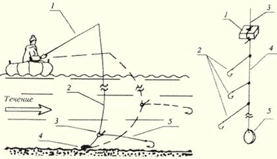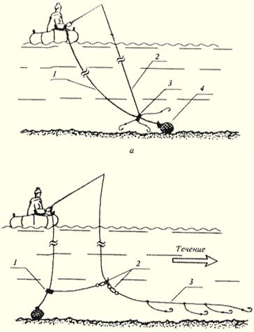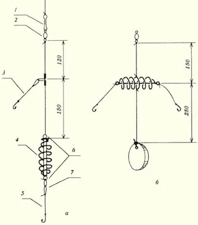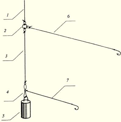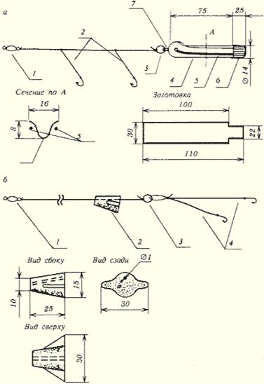 Рис. 10. Ходовая донка: 1 — основная леска; 2 — тройной вертлюжок; 3 — леска оснастки; 4 — карабин; 5 — грузило; 6, 7 — верхний и нижний поводки с крючками Донные снасти для ловли на разных горизонтах водоемаРазновидность донки, напоминающая ходовую и позволяющая облавливать разные горизонты воды (рис. 11, а) применяется на реках с крутыми берегами и при ловле с лодки. В этой снасти используется достаточно длинное удилище (можно и гибкое спиннинговое) с катушкой и пропускными кольцами. К леске привязывают грузило типа «ложки» массой 10–15 г, над которым помещают скользящее по леске колечко (лучше пропускное фарфоровое от спиннинга) с поводком длиной 50–60 см. При поднятии удилища колечко с поводком и крючком опустится ко дну, а при ослаблении (стравливании) лески за счет ее парусности — поднимется в верхние слои воды (показано пунктиром). Таким образом, облавливаются разные горизонты водоема на довольно значительном удалении. Этим способом, называемым «флорентийским», успешно ловят чехонь, жереха и других рыб, обитающих в реках с быстрым течением и на разной глубине. Рис. 11. Донные снасти для ловли на разных горизонтах воды: а — «флорентийская» донка (1 — удилище, 2 — основная леска, 3 — колечко, 4 — грузило, 5 — поводок с крючком); б — снасть для ловли чехони (1 — поплавок из пенопласта, 2 — поводки с крючками, 3 — основная леска, 4 — подлесок, 5 — грузило «ложка») Специально для ловли чехони А. Поповым из Днепродзержинска предложена другая снасть (рис. 11, б). К основной леске диаметром 0,4 мм привязывают брусок пенопласта размером со спичечный коробок, а к нему подсоединяют подлесок длиной 1,5–2 м, к которому с интервалами 20–25 см подвешивают три поводка с крючками № 5–7. К свободному концу подлеска привязывают грузило типа «ложка». После заброса пенопластовый поплавок поднимает поводки с приманкой (опарыш) в верхние слои воды. Чехонь обычно подсекается сама, о чем свидетельствует вздрагивание кончика спиннингового удилища или звон колокольчика. Ловят этой уловистой снастью (за один заброс при активном клеве можно поймать две-три рыбы) на глубине до 3 м. КольцовкаДо недавних пор эта донная снасть по совершенно непонятным причинам относилась к запрещенным. Кольцовкой пользуются, как правило, при ловле на глубине с лодки или плота леща и других карповых рыб (крупная плотва, голавль, сазан). Достоинством снасти является расположение крючков с приманкой непосредственно у прикормки, и этим объясняется ее высокая уловистость. В упрощенном варианте кольцовка показана на рис. 12, а (изображение по вертикали, естественно, сжато). На капроновый шнур кормушки надевают металлическое кольцо (можно гайку) с привязанными к нему поводками с крючками. С кольцом соединяют и основную леску. После наживления крючков кормушку опускают на дно с провисанием шнура. При подсечке кольцо поднимают по шнуру, вываживают рыбу и снова наживляют крючки. Кормушка представляет собой мелкоячеистую сетку с кашей, сдобренной макухой или перемолотыми поджаренными семечками, и грузом (камень), чтобы ее не сносило течением. В кольцовке обычно применяют короткое удилище с катушкой и пропускными кольцами. Недостатком этого варианта снасти является возможность зацепа крючков за кормушку. Можно, конечно, ограничить опускание кольца каким-либо стопором, но при этом потеряются достоинств