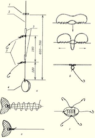 Рис. 1. Простейшая донка с «глухим» грузилом: а — донка в сборе (1 — палочка для руки, 2 — основная леска, 3 — поводки с крючками, 4 — грузило, 5 — кембрики); б — вязка петли для крепления поводка; в — привязка грузила; г — оснастка донки с грузилом-кормушкой в ложке При оснащении донки вначале на основной леске надо заготовить петли для привязки поводков с крючками. В этих целях делают большую петлю и 6–8 раз продевают через нее леску, затем посередине раздвигают скрученную часть лески и продевают большую петлю в образовавшуюся петельку (рис. 1, б). Остается только затянуть узел, и в результате на леске получится аккуратная петелька, к которой способом «петля в петлю» привязывают поводок длиной 8–10 см с крючком. Благодаря этой петле и упругости лески поводка (диаметром 0,25–0,3 мм) устраняется закручивание поводка за основную леску. Поводки легко снимаются для отдельного хранения, но можно их и не снимать, если выше петель расположить отрезки кембрика, которые надвигают на поводки с крючками. Это не единственный способ привязки поводков, но для донок, на наш взгляд, наиболее подходящий. К концу основной лески привязывают грузило массой 50–80 г (в зависимости от скорости течения). Грузило лучше отлить самому заливкой свинцом в старой столовой ложке, пробив в ней отверстие, в которое перед заливкой вставляют гвоздь. После заливки гвоздь вынимают — образуется отверстие для лески. Грузило-ложка при быстром движении в воде приподнимается со дна, благодаря чему уменьшается вероятность зацепов. Есть очень простой и надежный способ привязки грузил и других деталей с отверстиями (карабинов, застежек, заводных колец и т. д.). Конец основной лески складывают вдвое, пропускают эту петлю через отверстие в грузиле, прижимают ее к основной леске, коротким концом делают 4–6 оборотов на петле, продевают через нее конец лески и затягивают узел (рис. 1, в). Оснастку донки имеет смысл дополнить небольшой палочкой, привязав ее к леске на расстоянии 60–70 см от грузила. Палочка создает надежный упор для руки, что будет способствовать увеличению дальности заброса. Леску с оснасткой наматывают на мотовильце, которое лучше сделать из многослойной фанеры или доски толщиной 5–6 мм, удлинив и заострив один из концов для втыкания в землю. Намотку лучше выполнять «восьмеркой». При обычной круговой намотке после каждого оборота лески вокруг мотовильца она закручивается на один оборот вокруг своей оси. В случае намотки «восьмеркой» (по пол-оборота в одну и затем в другую сторону) леска не закручивается. Кроме того, она легко и просто сматывается с мотовильца. «Глухое» грузило можно выполнить в виде грузила-кормушки, размещенного, например, в столовой ложке (рис. 1, г). Концы пружины загибают через отверстия в ложке и внизу ее заливают свинцом. Крючки боковых капроновых поводков после наживления (червь, опарыш) всаживают головками в прикормку, которой набивают пружину с ложкой. Крючок на нижнем поводке в прикормку не втыкают. В донках могут успешно использоваться и подсекатели, многочисленные конструкции которых описаны в литературе для рыболовов. Недостатком донки с «глухим» грузилом является большое сопротивление обычно тяжелого грузила, оказываемое рыбе при поклевке. В результате такие осторожные рыбы, как лещ, карп, сазан и др., часто оставляют приманку. Кроме того, по