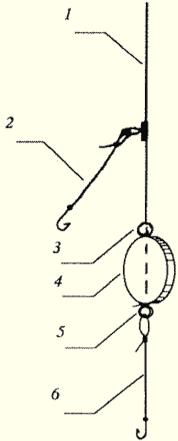 Рис. 13. Донка с всплывающим поплавком: а — оснастка (1 — тело поплавка, 2 — полиэтиленовая пробка, 3 — поводок с крючком, 4 — грузило, 5 — основная леска, 6 — узел крепления поводка); б — способ крепления поводка (1 — отрезок проволоки длиной 1,5 см и толщиной 1 мм, 2 — поводок, 3 — основная леска, 4 — хомутики из кембрика) Тело поплавка из пенопласта высотой 10 и диаметром около 2 см на клею вставляют в полиэтиленовую пробку с отрезанным донышком (рис. 13, а). Основную леску пропускают через кольцо на теле поплавка и отверстие в фланце пробки. С противоположной стороны фланца делают прорезь, в которую перед забросом заводят поводок длиной 10 см с наживленным крючком, соединенный с основной леской, как показано на рис. 13, б. На расстоянии примерно 40 см от поводка подвешивают «глухое» грузило. При поклевке поводок выходит из прорези, поплавок свободно поднимается вверх по основной леске и всплывает, давая сигнал к подсечке. (Б.Н. Красноголовый) | |
