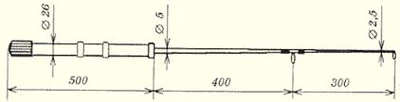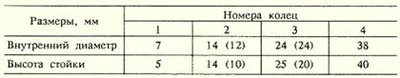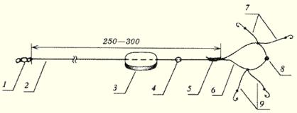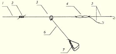 Рис. 2. Донка со скользящим грузилом: 1 — основная леска; 2 — верхний поводок с крючком; 3 — ограничительная бусинка; 4 — скользящее грузило; 5 — заводное кольцо; 6 — нижний поводок с крючком Рис. 3. Донка с подвесным скользящим грузилом: 1 — основная леска; 2 — стопор; 3 — скользящий держатель поводка с грузилом (пластинка с отверстиями); 4 — узел «петля в петлю»; 5 — поводки с крючками; 6 — поводок грузила; 7 — грузило Грузило лучше всего отлить в форме плоской пирамиды с прямоугольным основанием, хорошо удерживающим леску на месте заброса и не позволяющим крючку с приманкой перекатываться по дну. Поводок грузила длиной 5–10 см соединяют с основной леской различными способами: через петельку диаметром 1,5–2 мм на конце поводка, при помощи пластинки из оргстекла или даже пуговицы с двумя отверстиями (верхнее — для пропускания лески, нижнее — для привязки поводка) и др. Длину поводков, на конце которых привязаны крючки, устанавливают 15 и 25 см. Поводок грузила должен быть примерно в два раза тоньше основной лески для ее сохранения при зацепах и не очень сильного прижатия приманки ко дну. По отзывам опытных рыболовов, донки со скользящими подвесными грузилами более уловисты, чем все остальные, и особенно при ловле на течении. Донка на основе спиннингаВ последнее время широко применяются донные снасти с катушками и пропускными кольцами. Выполняются эти снасти на базе спиннинговых удилищ, что дает право назвать их кратко «спидонками». Для ловли с берега хорошо подходит складной спиннинг с металлическим полым хлыстом, резьбовым катушкодержателем и деревянной рукояткой Уд1 м, выпускаемый Ленинградским адмиралтейским объединением. Хлыст снабжен четырьмя ПК с внутренними диаметрами от 7 («тюльпан») до 24 мм. Для снасти с ИК, например типа «Невская», кольца можно не переделывать, за исключением, может быть, «тюльпана», который нужно заменить фарфоровым или стальным ПК, но из более твердой стали. Общая длина спиннинга в собранном для ловли виде — около 190 см. Катушку устанавливают внизу с левым расположением рукоятки. При забросе барабан тормозят большим пальцем правой руки, а подмотку производят вращением ручки от себя после поворота удилища с катушкой на 180°. В случае использования БК систему ПК все-таки лучше модернизировать. Если сохранить неизменным расположение колец, то в результате расчета получатся следующие размеры колец (табл. 1). Таблица 1. Основные размеры пропускных колец для удилища Уд1 м, оснащенного БК В основу расчета были положены данные широко применяемой в «спидонках» катушки КВС-671. В «спидонках» могут использоваться и другие, относительно силовые модели БК, например, катушка «Орион-003», имеющая большую вместимость шпули (100 м лески диаметром 0,4 мм), чем «Орион-001», и меньшее передаточное число (3,4), за счет чего облегчается вываживание крупной рыбы. Габариты катушки несколько увеличены при сохранении почти той же массы. Достаточно мощной является и катушка «Дельфин-8», отличающаяся точностью выполнения всех деталей и плавностью хода механизма. Большая вместимость шпули юбочного типа (100 м лески диаметром 0,5 мм, или 80 м — 0,6 мм) позволяет ее использовать для ловли очень крупной рыбы. Эта катушка несколько тяжеловата (около 400 г) и лучше ее применять в двуручных спиннингах. Вернемся, однако, к модернизации комплекта ПК применительно