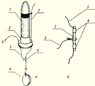 Рис. 12. Кольцовка: a — упрощенный вариант (1 — шнур кормушки, 2 — основная леска, 3 — металлическое кольцо, 4 — кормушка); 6 — усовершенствованная конструкция (1 — кольцо, 2 — вертлюжки, 3 — подлесок с поводками и крючками) Кольцо овальной формы обычно выполняют из прутка припоя длиной 15–18 см, концы которого обрубают наискось, а при их стыковке на узкую щель надвигают резиновую трубку. Такая конструкция позволяет надевать кольцо, минуя мотовильце шнура и узел крепления кормушки на борту лодки и облегчает процедуру смены колец, что часто приходиться делать, подбирая необходимую их массу. Донка с всплывающим поплавкомЭта остроумная снасть, называемая за рубежом «лифт-корк» («всплывающий поплавок»), особенно эффективна, если дно водоема илистое или покрыто травой.
