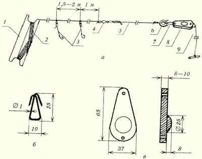 Снасти для ловли рыбы со дна (донные удочки, или кратко донки) широко распространены среди рыболовов-любителей. Донки, как правило, портативны и транспортабельны, не требуют большого внимания в процессе ловли, и удильщик меньше устает. Донки с одинаковым успехом могут применяться в любую погоду и в любое время суток при ловле как с берега, так и с лодки. Донная удочка позволяет забрасывать приманку на 50 м и дальше, может использоваться на закрытых и открытых водоемах различной глубины, но предпочтительнее большие полноводные реки (Днепр, Припять, Неман и т. п.) и обширные водохранилища (Вилейское, Заславское, Нарочанская система озер и др.). Донки рассчитаны чаще всего на добычу крупной рыбы. Как писал Л. П. Сабанеев, «…ужение на донные удочки едва ли не самый распространенный способ ловли крупной рыбы в большей части России», и еще: «Настоящее ужение леща на донную употребляется как в реках на течении, так и в стоячей воде». Надо также отметить, что приманка донки, располагаясь на дне (отсюда и название снасти), выглядит более естественно, чем висящая вертикально у поплавочной удочки, и рыба берет ее охотнее. Ведь в природе червь не бывает подвешен, а лежит на дне, или его сносит течением. К тому же леска у донки меньше выделяется на фоне дна и не так отпугивает рыбу, как у поплавочной удочки. Рыболовы нередко сочетают активную ловлю поплавочной удочкой с относительно пассивной — донкой. В рыболовной практике находят применение самые разнообразные типы донок. Мы кратко рассмотрим хорошо зарекомендовавшие себя и наиболее перспективные донные снасти, отвечающие современным тенденциям. Простая донкаДля оснащения донок используются три вида грузил: «глухие» — неподвижно закрепляемые на леске, скользящие различной формы и подвесные. Простейшая донка с «глухим» грузилом (рис. 1, а) состоит из основной лески толщиной 0,4–0,8 мм (в зависимости от вида и размеров предполагаемой добычи) с оснасткой и некоторых дополнительных элементов.