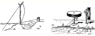 Если на поплавочной удочке вдвое увеличить длину лески, передвинуть поплавок к самой вершинке удилища и утяжелить груз – эта снасть станет прообразом простейшей донки. Так, кстати, и делают многие поплавочники, когда после паводка или дождя приходится удить в замутненной воде или на очень сильном течении. Однако простейшей донке не требуется такого длинного удилища: оно не участвует ни в забросе, ни в подсечке, ни в вываживании добычи. Все эти операции выполняются исключительно руками рыболова. Да и поплавок, висящий над водой, не самый лучший «сторож» поклевок. Простейшая донка состоит из короткого (до 1 м) удильника, оснащенного катушкой или мотовильцем, запаса лески в 35—50 м, грузила и поводков с крючками. Рис. 1. Общий вид простейших донок УдильникОбычно его делают из нетолстого древесного (чаще можжевелового) хлыстика. Комлевый конец его заостряют, чтобы было легче воткнуть в грунт, а на вершинке устраивают петельку для крепления лески в рабочем состоянии. Эту петельку делают точь-в-точь так же, как на поплавочной удочке: согнутый пополам отрезок лески диаметром 0,35—0,5 мм приматывается нитками к удильнику ниже среза вершинки на 1,5—2 см и обмотку пропитывают водостойким клеем. Если удильник снабжен катушкой, то на его вершинку целесообразнее установить пропускное кольцо-тюльпан. Удильники для донок изготовляют из различных подсобных материалов – из металлических трубок, стальных прутков и пластинок, из винипласта и т. п. Многие рыболовы все чаще и чаше используют для донной охоты короткие (до 2 м) удилища фабричного изготовления из бамбука, стеклопластика и углепластика, снабженные катушками и пропускными кольцами. ЛескаЕсли удильники поражают воображение своим разнообразием, то этого нельзя сказать о лесках. Поскольку с донной удочкой приходится охотиться в самых разных условиях, главное требование к леске – ее универсальность. Во-первых, чтобы она могла выдержать борьбу с крупной добычей, а во-вторых, не сильно бы огрубляла снасть. Самыми подходящими для донок считаются силоновые лески диаметром 0,35– 0,50 мм. ГрузилоПри выборе формы, веса груза и способа его крепления на лесе надо руководствоваться соображениями целесообразности. Скажем, если прибрежный участок дна пологий, то вряд ли будет удобно здесь пользоваться легким грузом: далеко его не забросишь, а близко рыбы нет. Наоборот, на озере, пруду или речке со слабым течением не нужен очень тяжелый груз. Если в водоеме дно илистое или каменистое, практичнее «окатыш» – груз округлой формы. На сильном течении с песчаным дном лучше будет «лежать» плоский груз. Широко распространены три способа крепления. Первый и самый практичный – когда грузило подвязывается к концу рабочей части лески, а 1—2 поводка длиной 15—25 см размещаются выше его. Второй – когда груз имеет продольное сквозное отверстие и скользит выше поводков по пропущенной в это отверстие леске. Карабин, с помощью которого поводки соединяются с основной леской, одновременно служит ограничителем для движения скользящего грузила вниз. Наконец, третий способ – когда груз на отдельном подлеске длиной 40—50 см размещается между поводками, привязанными к основной леске как выше места крепления груза, так и ниже его. Поводки при этом располагаются на таком расстоянии друг от друга, чтобы исключить зацепы крючков. П